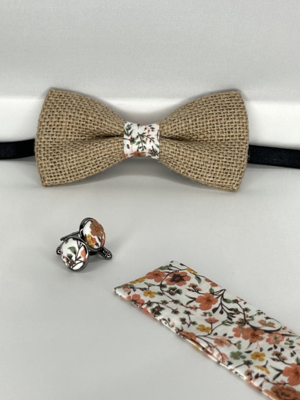 Voici notre coffret composé d'un élégant nœud papillon en toile de jute naturel, de boutons de manchettes et d'une pochette mouchoir assortis en tissu fleuri de haute qualité, tous fabriqués à la main en France.