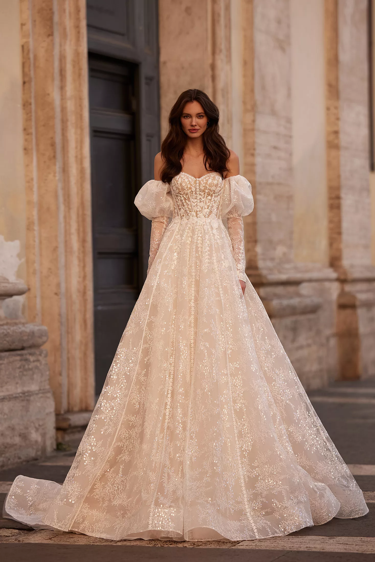 Préparez-vous à être ensorcelée par le charme envoûtant de la robe Bliss. Le corsage, doté d'un décolleté cœur, trouve un soutien élégant dans des bretelles fines ornées de perles, tandis que des manches ballon amovibles confèrent une essence royale à l'ensemble. Des couches abondantes de dentelle, de sequins transparents scintillants et de broderies de perles s'unissent pour créer une œuvre d'art iconique. Un train chapelle, orné d'une tresse en crin de cheval à la base, apporte une touche finale impeccable à ce style exquis.