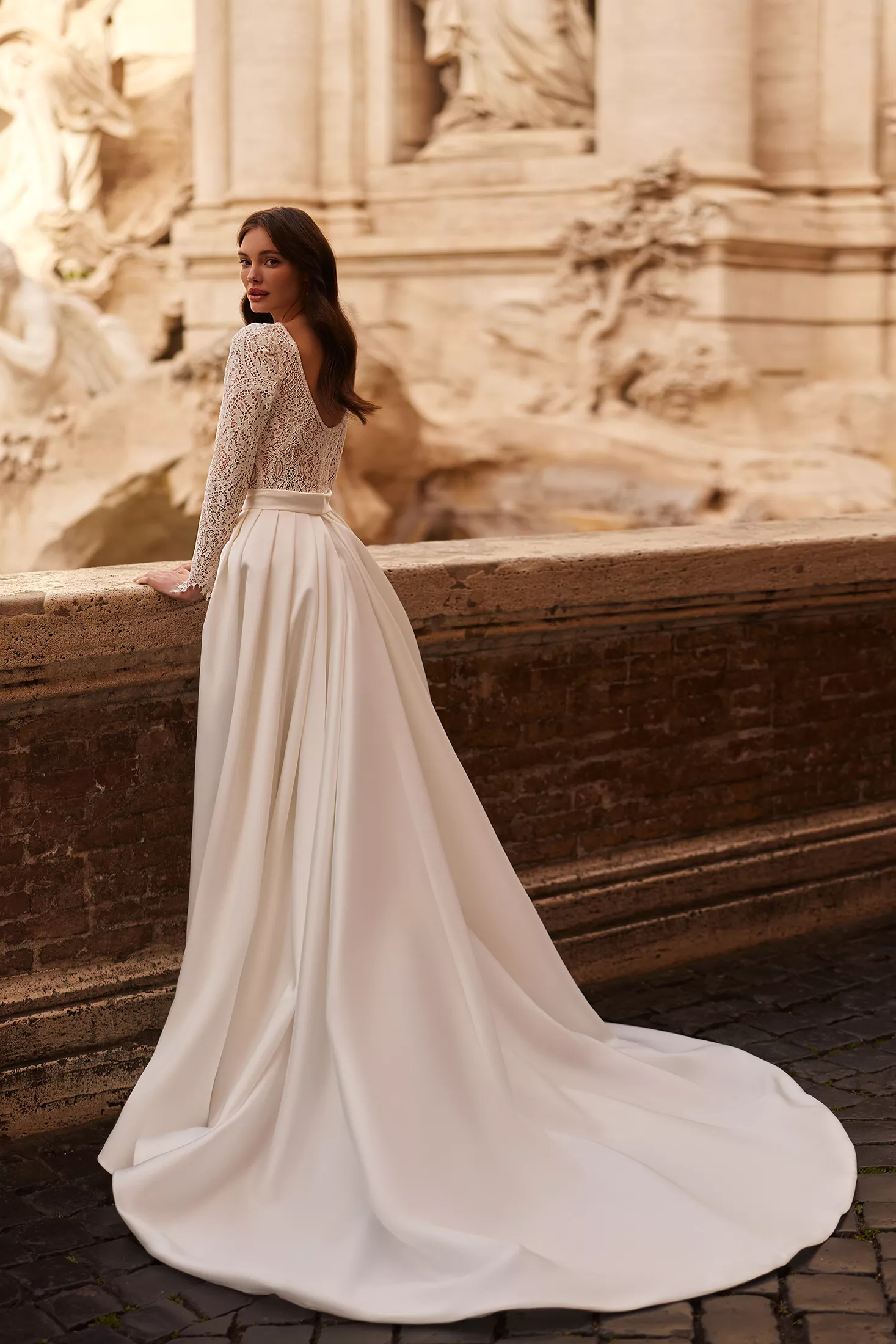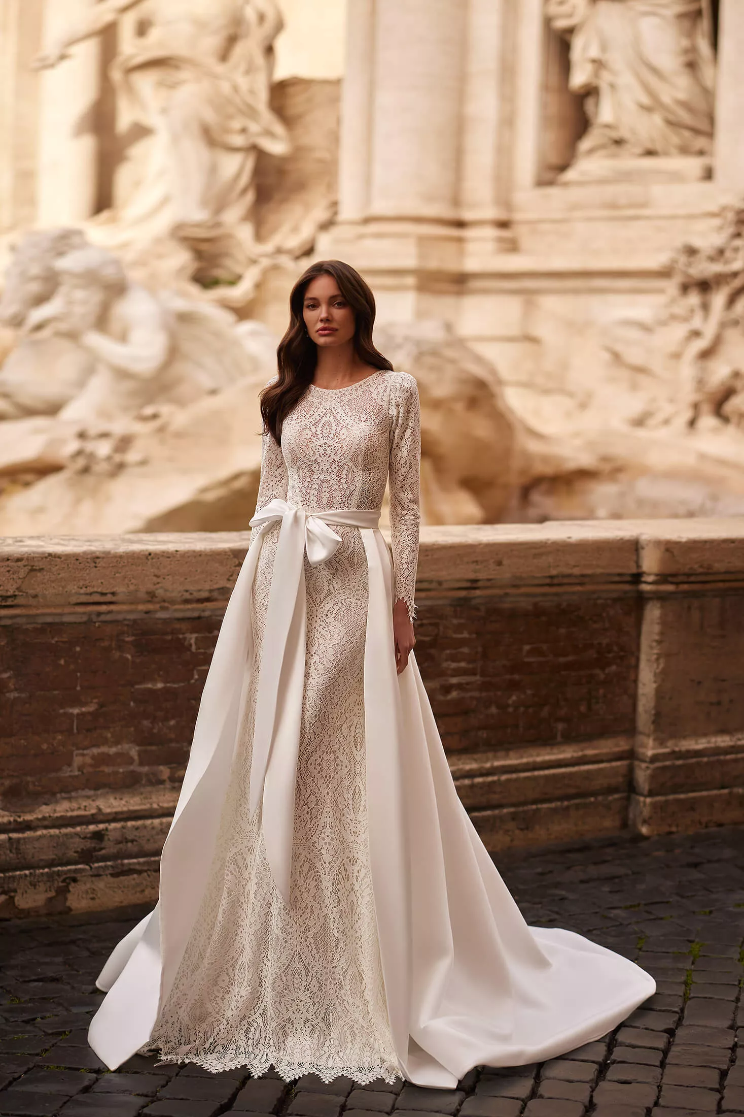 Chic sans effort tout en dégageant une élégance intemporelle, la robe sirène à manches longues Eduarda est une vision de sophistication. Confectionnée dans de délicates dentelles couvrant toute la robe, cette création est accompagnée d'un luxueux train en organdi épais, attaché délicatement à la taille. Pour ajouter une touche de raffinement, la taille de la robe est élégamment ornée de perles, créant un effet de définition qui sublime la silhouette.