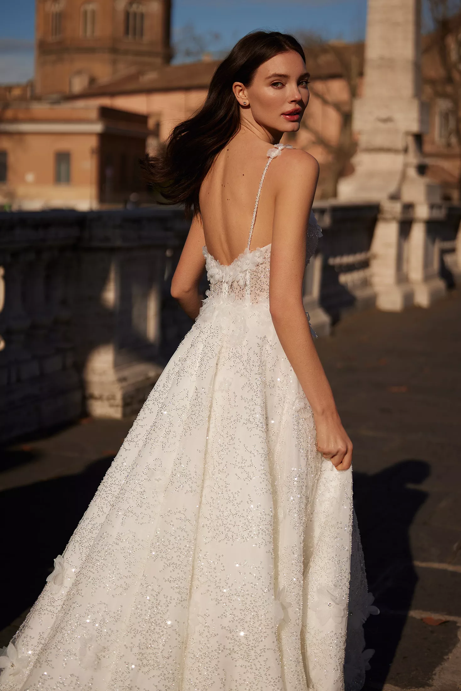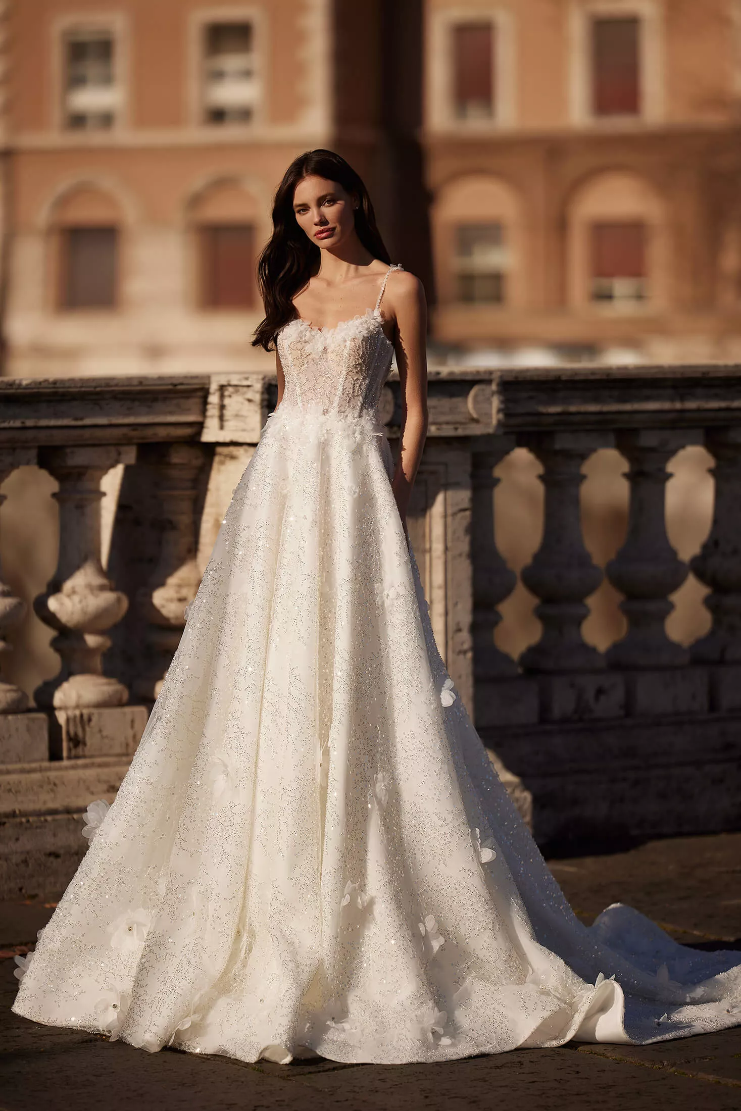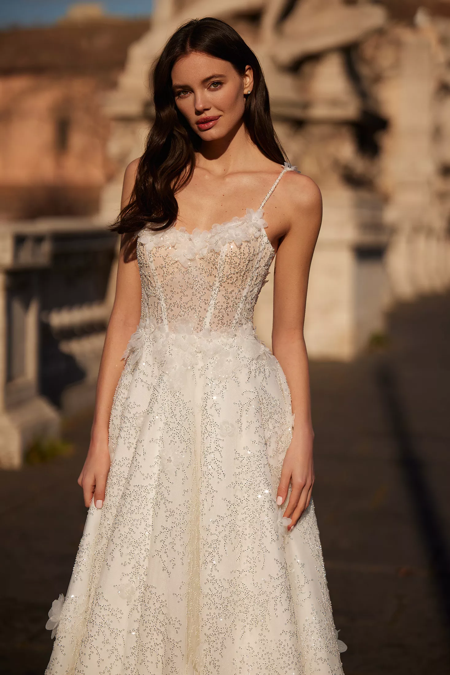 Ressentez-vous comme une princesse dans la robe de mariée Antalia. Confectionnée dans un tissu magnifiquement orné de motifs complexes, de perles et de sequins, elle crée un look de mariée inoubliable. Dotée d'un corset au dos en V profond ouvert et de fines bretelles perlées pour le soutien, elle dégage une grande élégance. Le décolleté, la taille et la jupe sont embellis de délicates fleurs en tulle et de perles, ajoutant une touche de romance et de sophistication. Un galon en crin de cheval termine l'ourlet de la jupe en A, apportant structure et volume, tandis qu'un train de chapelle ajoute une touche royale à cette robe véritablement enchanteresse.