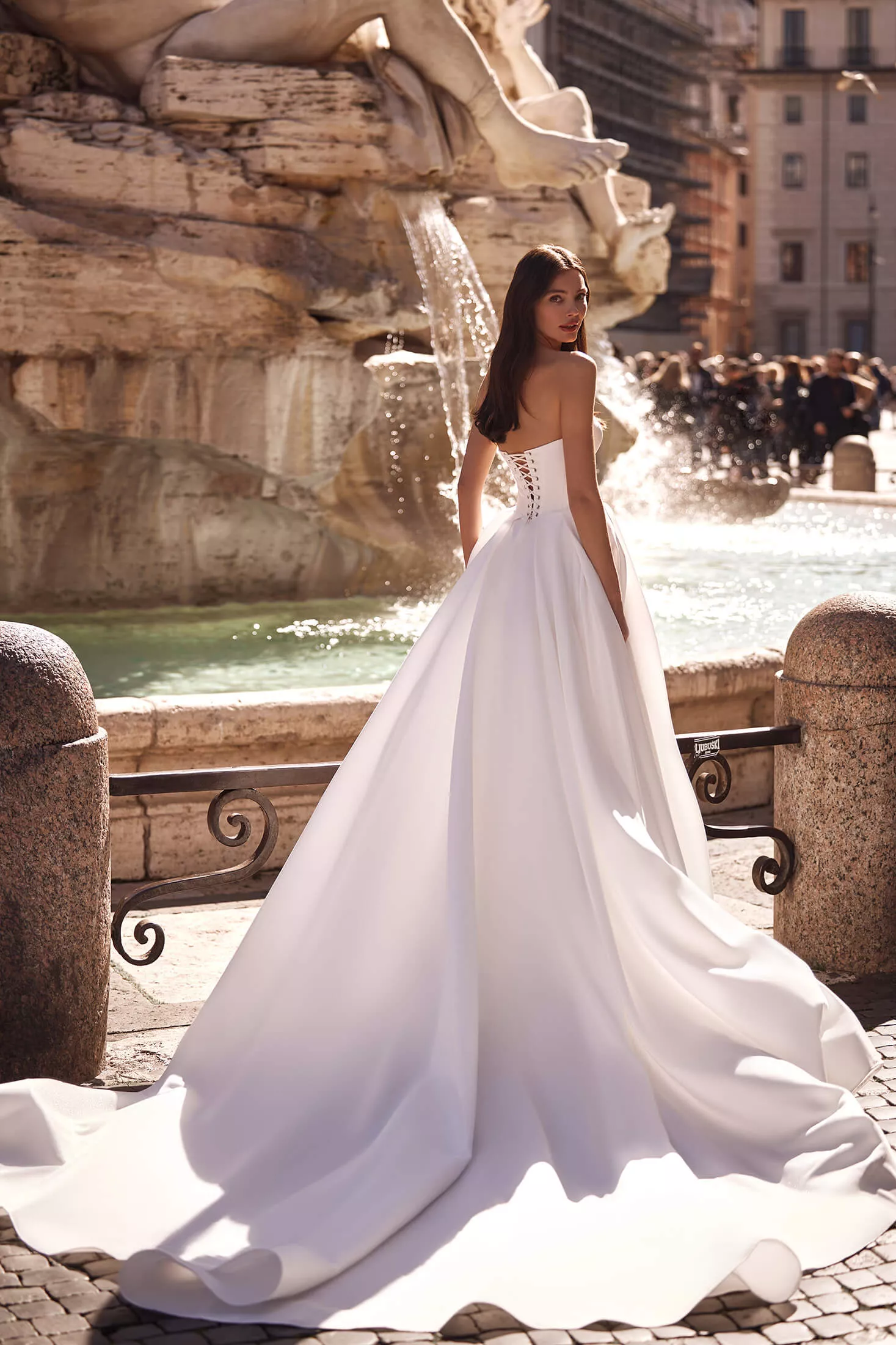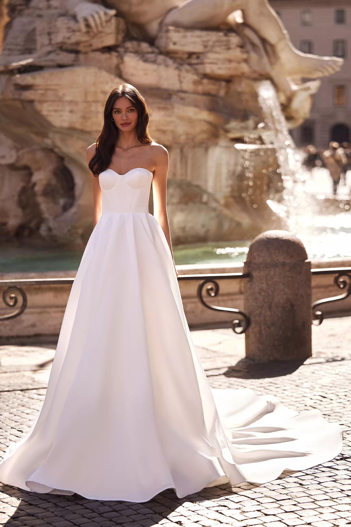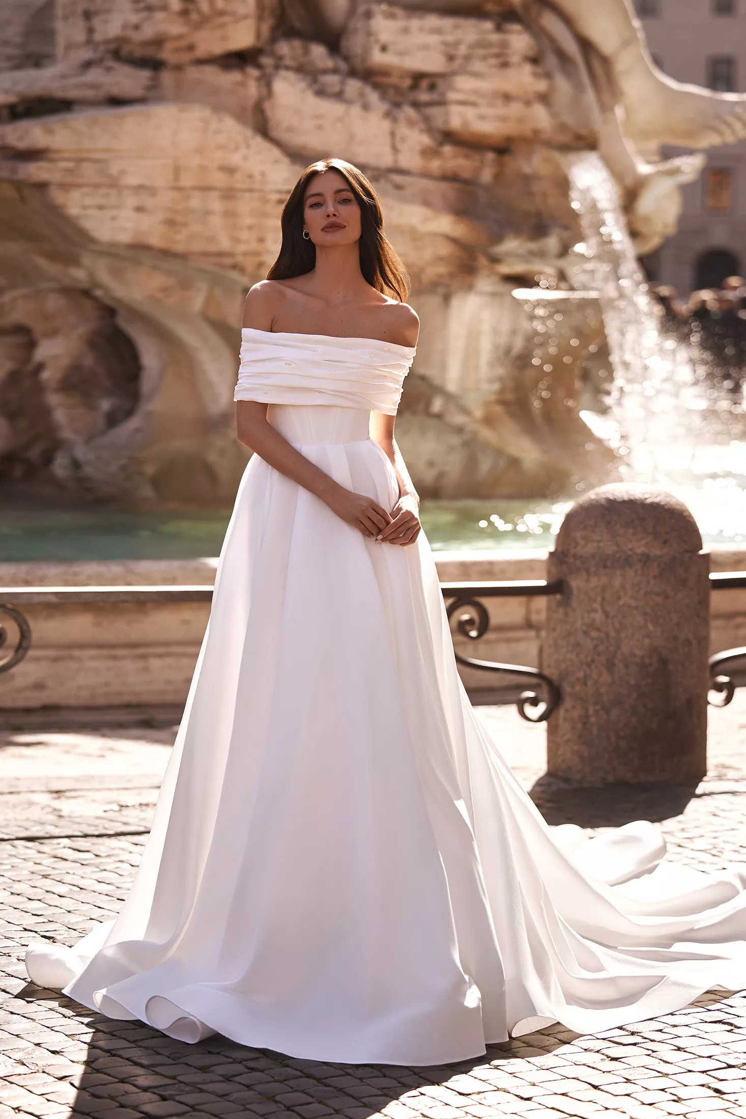 Mettez en valeur votre élégance avec notre somptueuse robe Gerda, confectionnée dans un somptueux tissu atlas brillant. Cette création exquise est dotée d’un boléro plissé détachable, orné de perles, apportant à la fois polyvalence et raffinement. Une fois retiré, il révèle un corset bustier avec bonnets définis, sublimant la silhouette avec grâce. Le dos est agrémenté d’un laçage, permettant un ajustement personnalisé tout en ajoutant une touche romantique. L’ourlet de la jupe évasée est délicatement structuré par un galon en crin de cheval, offrant volume et maintien pour une silhouette majestueuse. Une traîne chapelle vient parfaire l’ensemble avec une touche royale, faisant de cette robe un choix envoûtant pour un mariage d’exception.