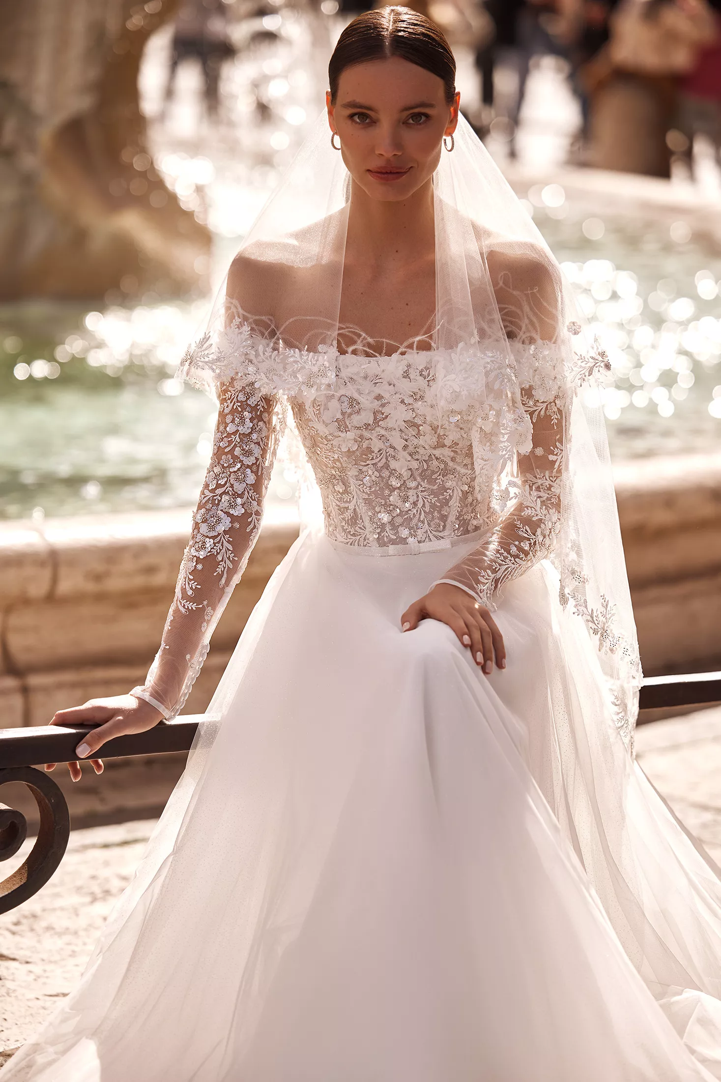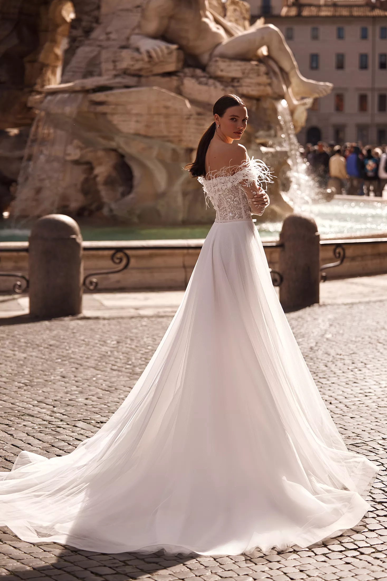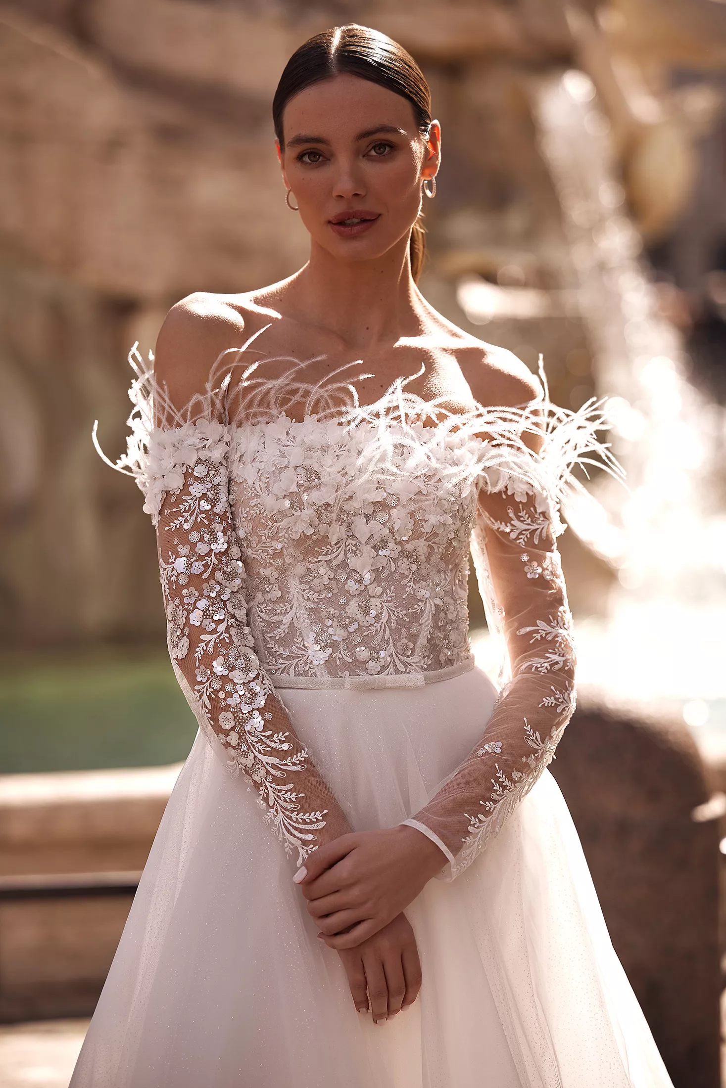 Rayonnez de féminité dans l'envoûtante robe Aqua. Cette création à manches longues et épaules dénudées sublime la silhouette avec un corsage somptueux en son centre. Des dentelles finement travaillées dessinent un effet perlé luxueux, tandis que de délicates plumes ornent l’encolure, ajoutant une touche de glamour inégalée. Une ceinture amovible en nœud pailleté souligne gracieusement la taille, tandis que la jupe évasée en tulle scintillant diffuse un éclat subtil. Structurée par un galon en crin de cheval, elle offre volume et fluidité, sublimée par une majestueuse traîne chapelle. Pour une allure parfaitement harmonieuse, associez la robe Aqua à son voile assorti.
