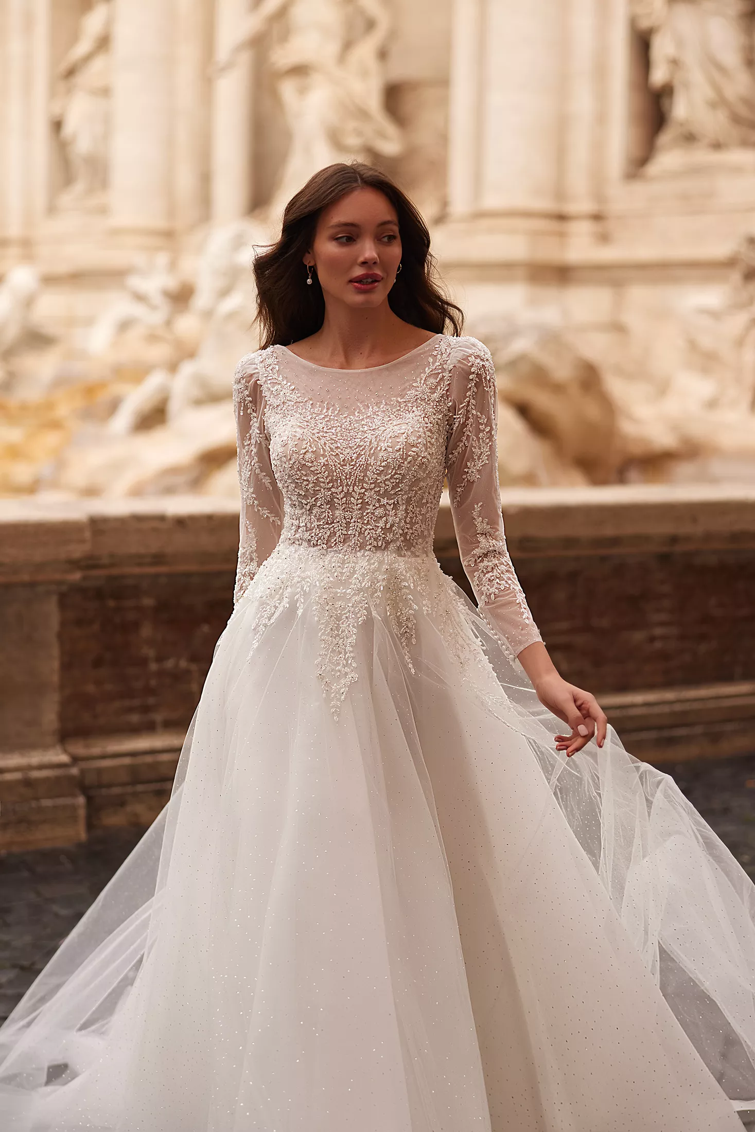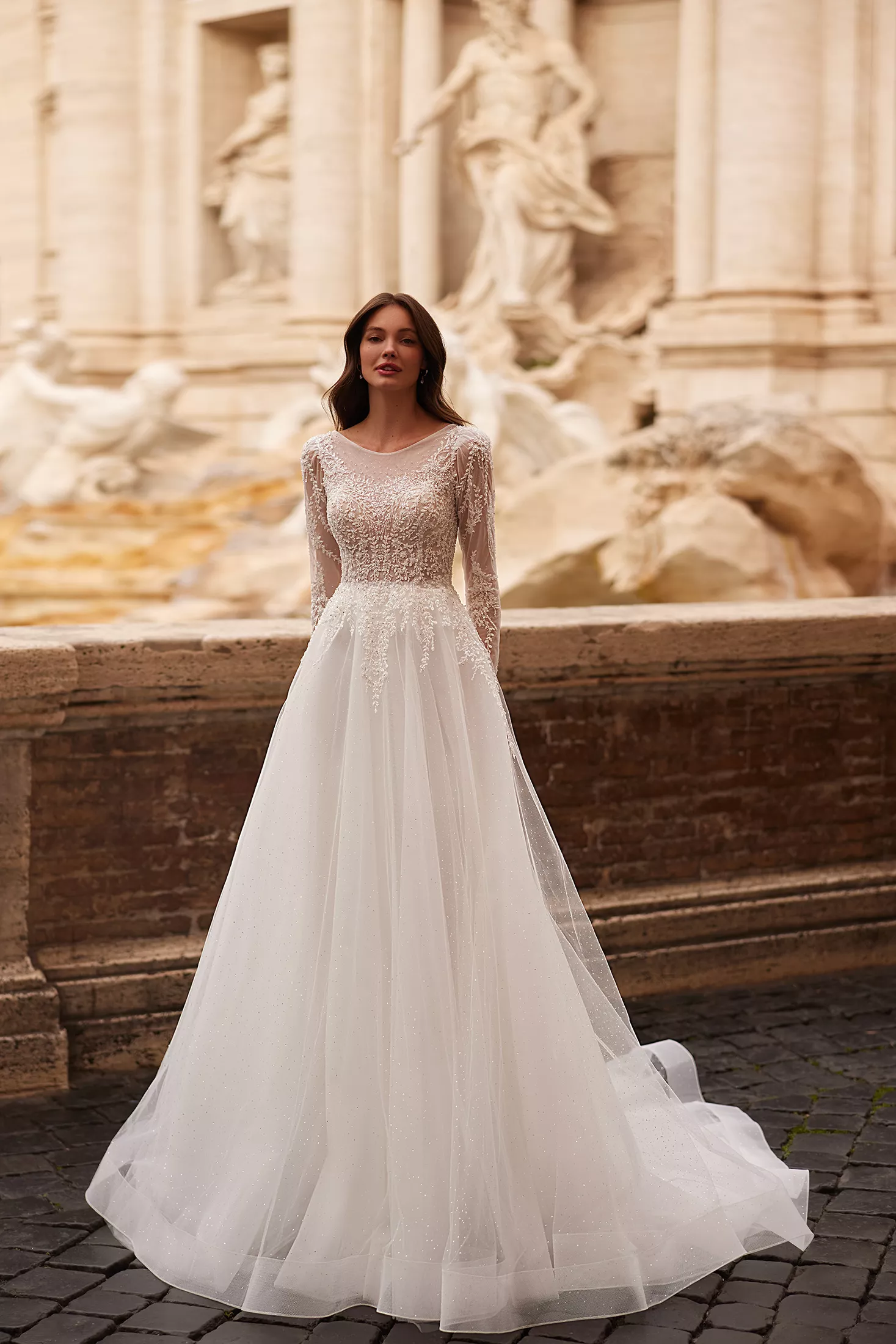 Le modèle Glen allie avec élégance simplicité et opulence. Cette robe se distingue par son haut à manches longues et son encolure bateau en V, confectionné en tulle scintillant semi-transparent pour une touche de sensualité. Le corsage est orné d'appliqués floraux exquis, minutieusement brodés de perles et de sequins, captant la lumière à chaque mouvement. Ces délicates broderies se prolongent harmonieusement sur la taille naturelle avant de se fondre dans la jupe en tulle pailleté. Structurée par un galon en crin de cheval, la jupe offre volume et fluidité, sublimant chaque pas de la mariée. Une traîne chapelle vient parfaire cette création majestueuse, garantissant une entrée des plus royales.