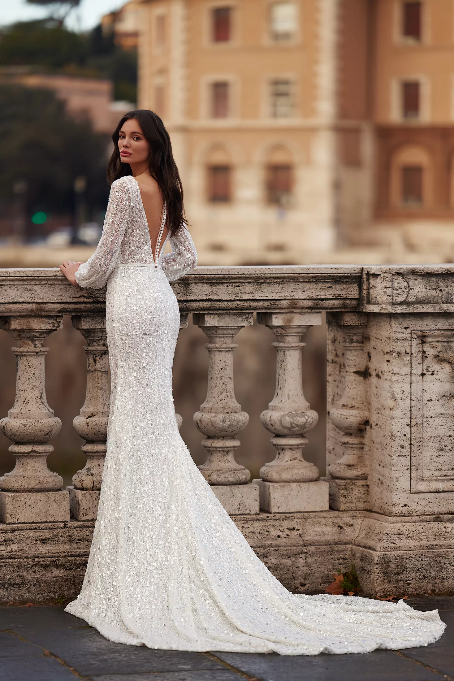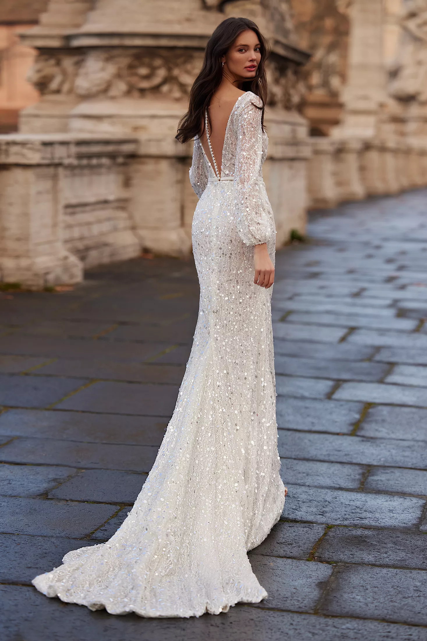 Cette somptueuse robe ajustée à manches longues incarne luxe et sophistication. Confectionnée dans un tissu richement orné de perles et de sequins aux motifs délicats, elle compose une silhouette inoubliable. Son décolleté illusion en V profond ajoute une touche de sensualité au corsage en tulle léger, tandis que le dos illusion en V se ferme élégamment par une rangée de boutons soignés. Une fine ceinture amovible scintillante souligne la taille et met en valeur les courbes avec finesse. Pour parfaire cette création d’exception, une traîne chapelle apporte une touche de majesté à chaque pas de la mariée.