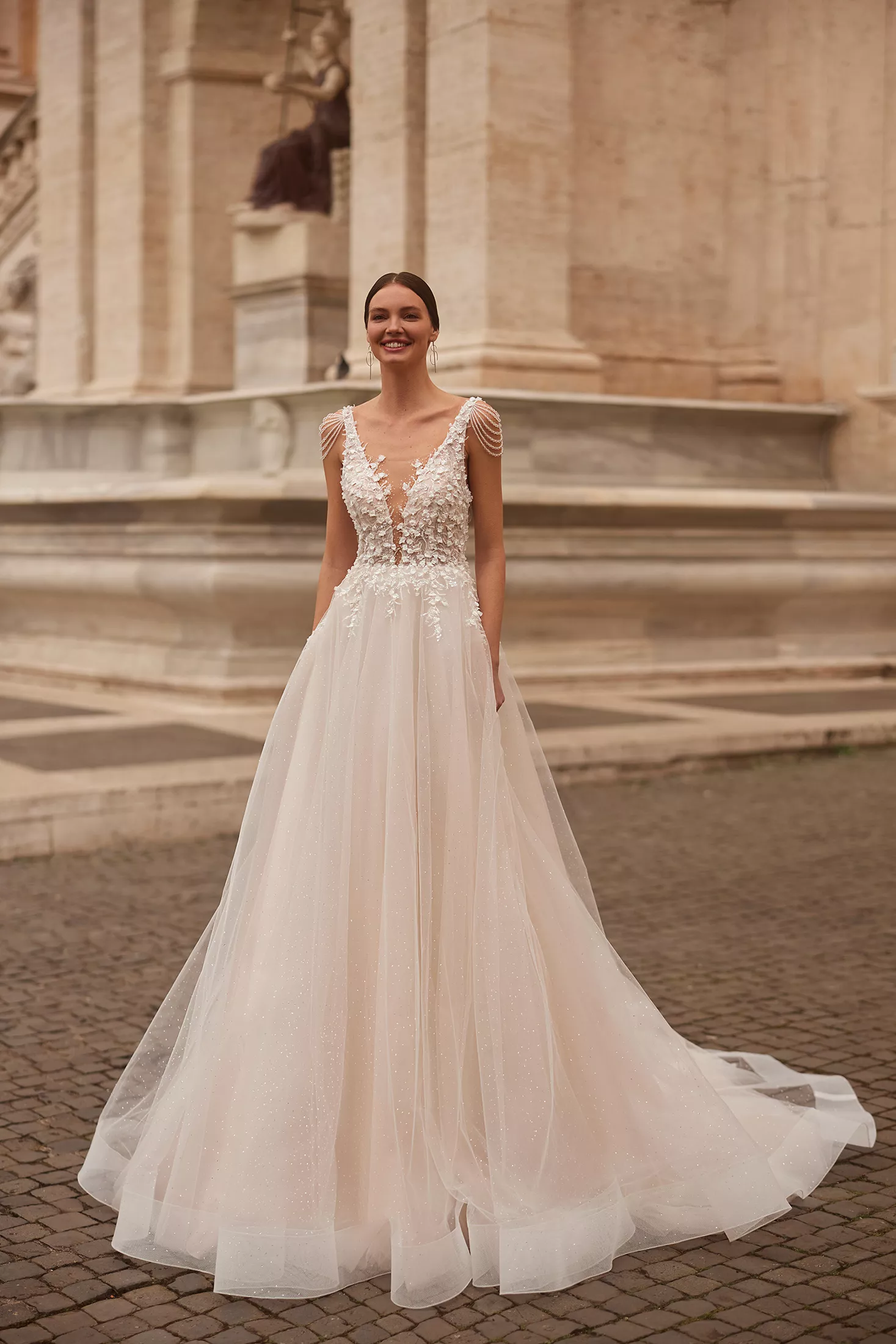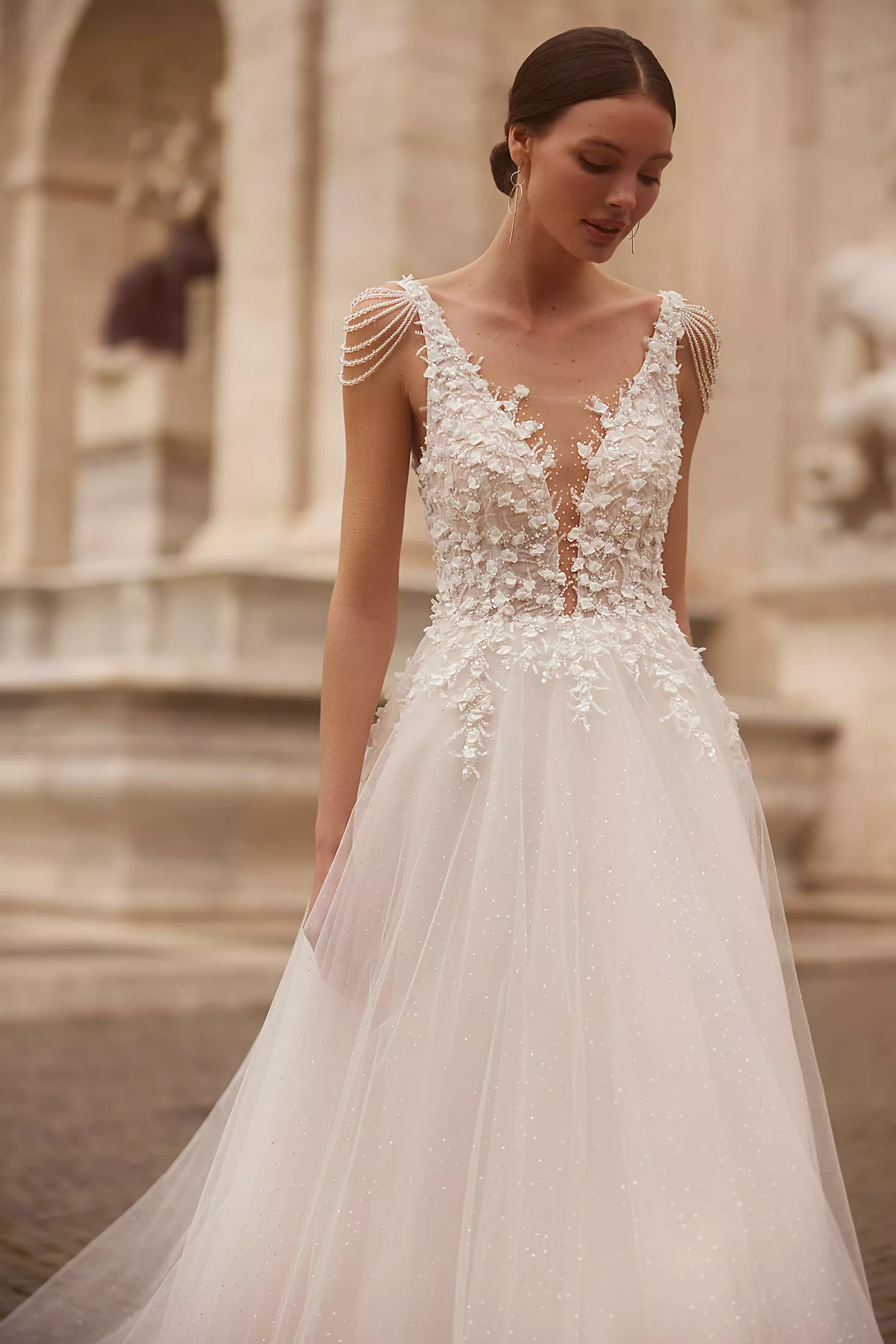 La robe Spenser allie avec harmonie douceur et sophistication. Son corset délicatement orné de dentelle et de perles incarne l’élégance et le raffinement. Un détail en cristaux sur les épaules apporte une touche majestueuse, sublimant l’ensemble avec finesse. La jupe évasée, confectionnée en tulle subtilement pailleté et bordée d’un galon en crin de cheval, offre une silhouette fluide et structurée, équilibrant volume et légèreté. Pour parfaire ce look enchanteur, un voile assorti à deux niveaux vient apporter une touche finale spectaculaire, enveloppant la mariée d’un éclat inoubliable.