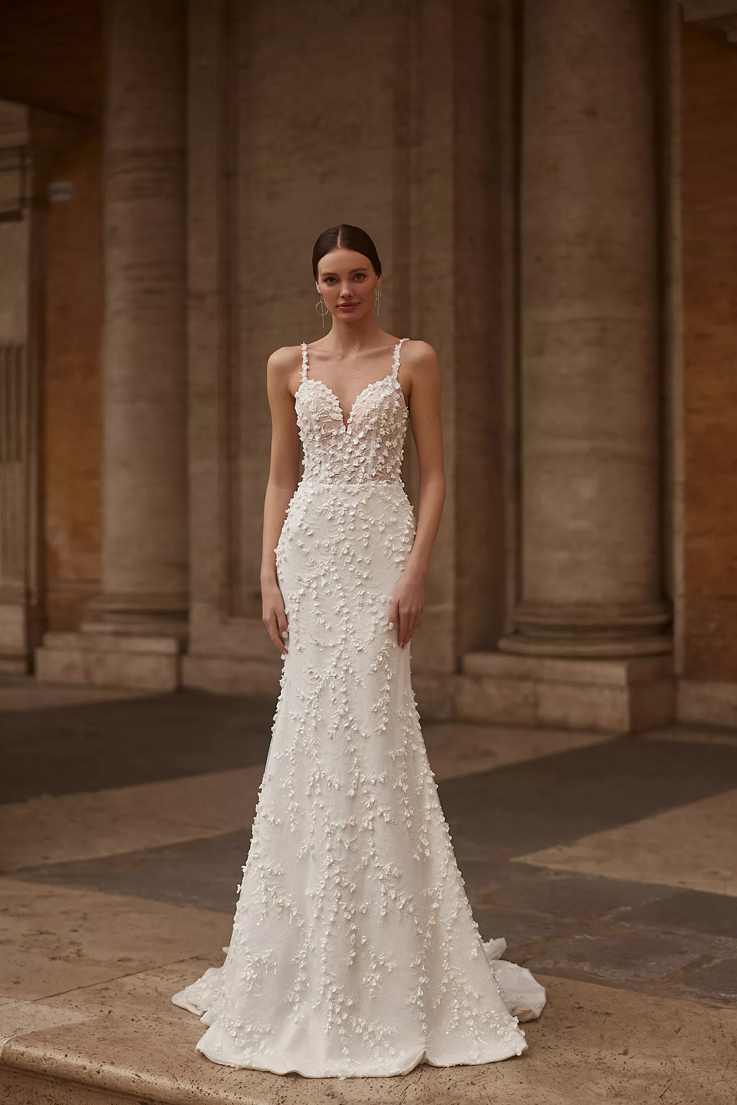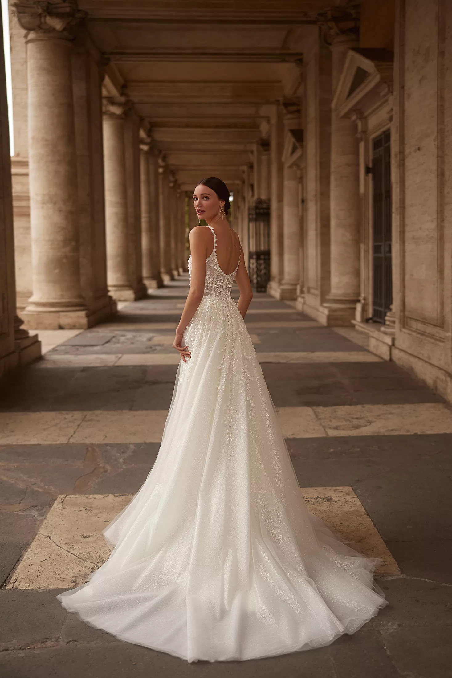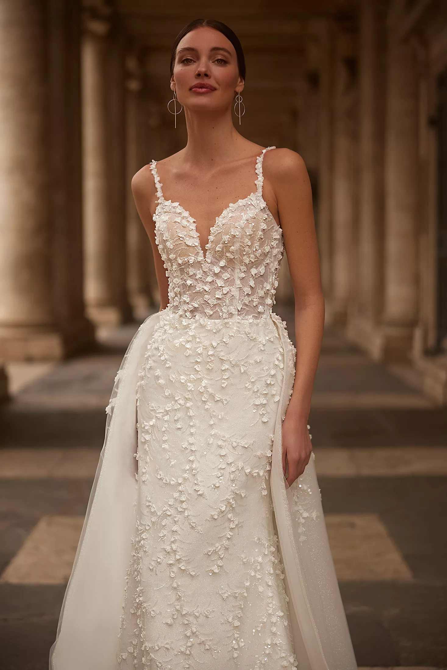 Préparez-vous à captiver tous les regards avec la robe de mariée Lotus, une création à la fois romantique et sensuelle. Sa silhouette ajustée, confectionnée en tulle subtilement pailleté, diffuse une brillance délicate qui sublime son allure enchanteresse. Le corsage et la jupe sont magnifiquement ornés d’une dentelle florale en 3D, rehaussée de perles scintillantes, créant un effet spectaculaire et raffiné. Pour une touche supplémentaire de glamour et de grandeur, une sur-jupe en tulle pailleté, agrémentée de dentelle assortie, vient parfaire cette tenue éblouissante.