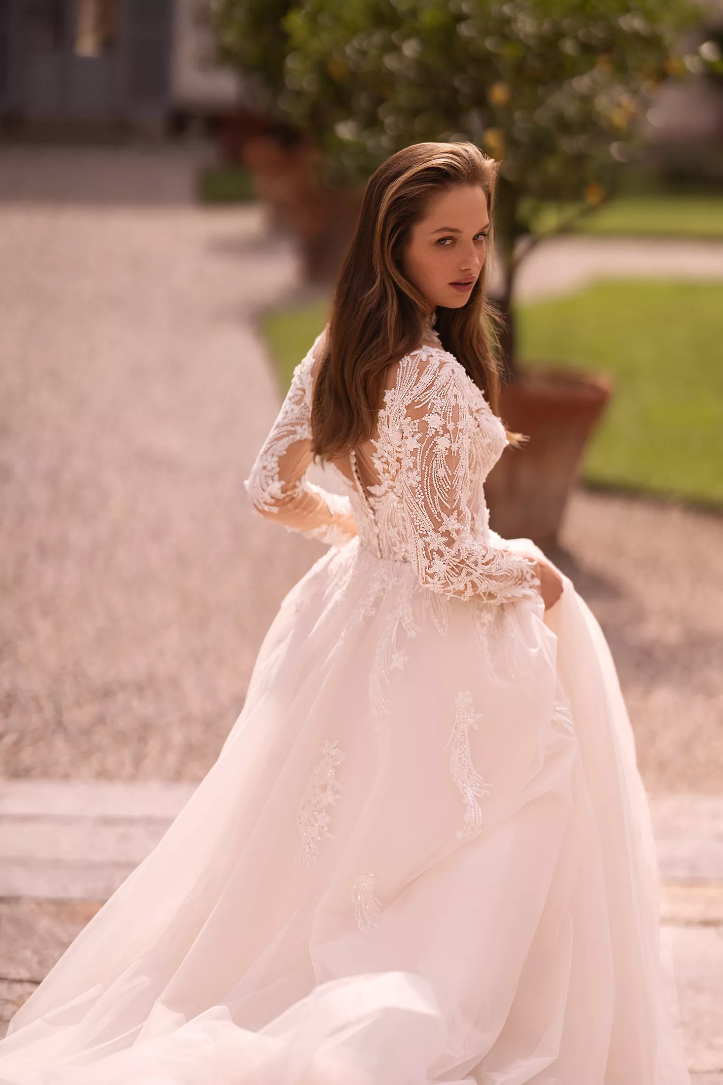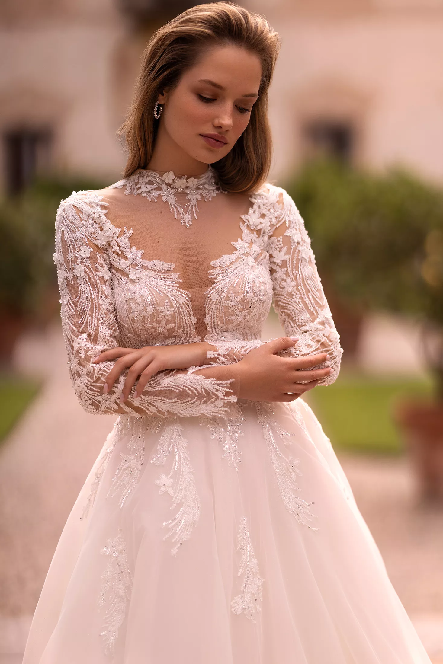 La robe enchanteresse Edna captive les cœurs dès le premier regard, offrant à la mariée une allure de véritable princesse pour son grand jour. Son corsage à manches longues est orné d’une somptueuse broderie de dentelle, sublimée par des sequins et des perles. Le col montant en dentelle, associé à un décolleté illusion plongeant, ajoute une touche de raffinement et d’audace. De délicates appliques florales se déploient gracieusement le long de la taille et se fondent dans une jupe fluide, sublimée par un subtil tulle pailleté. Le dos boutonné apporte une élégance intemporelle, tandis que la traîne de longueur chapelle confère une touche de majesté. Enfin, le galon en crin de cheval à l’ourlet assure une structure impeccable à cette création féérique.