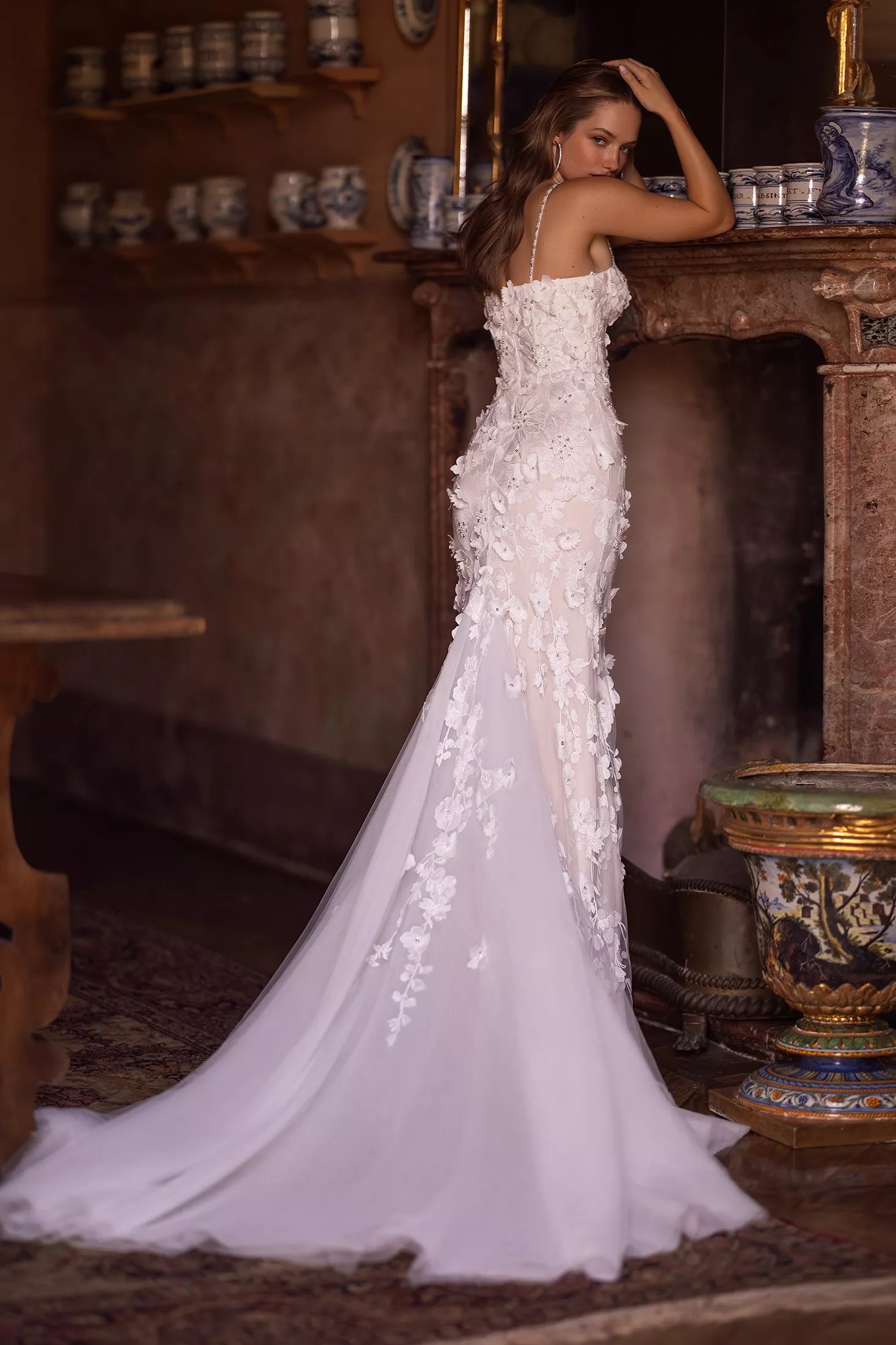 Le modèle Raquel est une véritable ode à la beauté de la nature, où les fleurs prennent vie dans une harmonie envoûtante d’élégance et de charme. Son corsage, doté de bonnets délicatement dessinés, est sublimé par de fines bretelles perlées qui encadrent avec grâce les épaules. La jupe ajustée épouse la silhouette avant de se fondre dans une traîne en tulle lisse de longueur chapelle, ajoutant une touche de romance et de raffinement à l’ensemble. Ce qui distingue réellement cette robe, c’est son ornementation somptueuse. Une dentelle florale en 3D, minutieusement brodée de perles et de sequins, crée un effet spectaculaire, digne d’un jardin féerique. Un tourbillon de fleurs qui émerveillera tous les regards et fera de la mariée une vision enchantée en ce jour inoubliable.