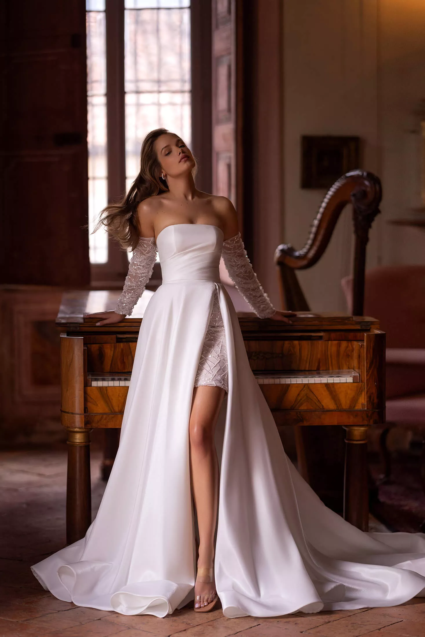 Adoptez l'équilibre parfait entre luxe et minimalisme avec cette somptueuse robe de mariée bustier. Confectionné en mikado somptueux, le corset arbore un décolleté droit épuré et un laçage dans le dos, apportant une touche d’allure à cette création raffinée. Une jupe courte en dentelle perlée vient sublimer l’ensemble, créant une harmonie envoûtante entre élégance et modernité. Pour une touche personnalisable, des manches amovibles en dentelle assortie permettent à la mariée de jouer avec son style au fil de la journée. Une surjupe en mikado à coupe évasée, fendue sur le côté, transforme la silhouette en une véritable œuvre majestueuse, drapant la mariée d’une sophistication royale. Enfin, une traîne chapelle vient parfaire l’ensemble, insufflant une aura de grâce et de grandeur à cette création où opulence et simplicité se rencontrent à la perfection.