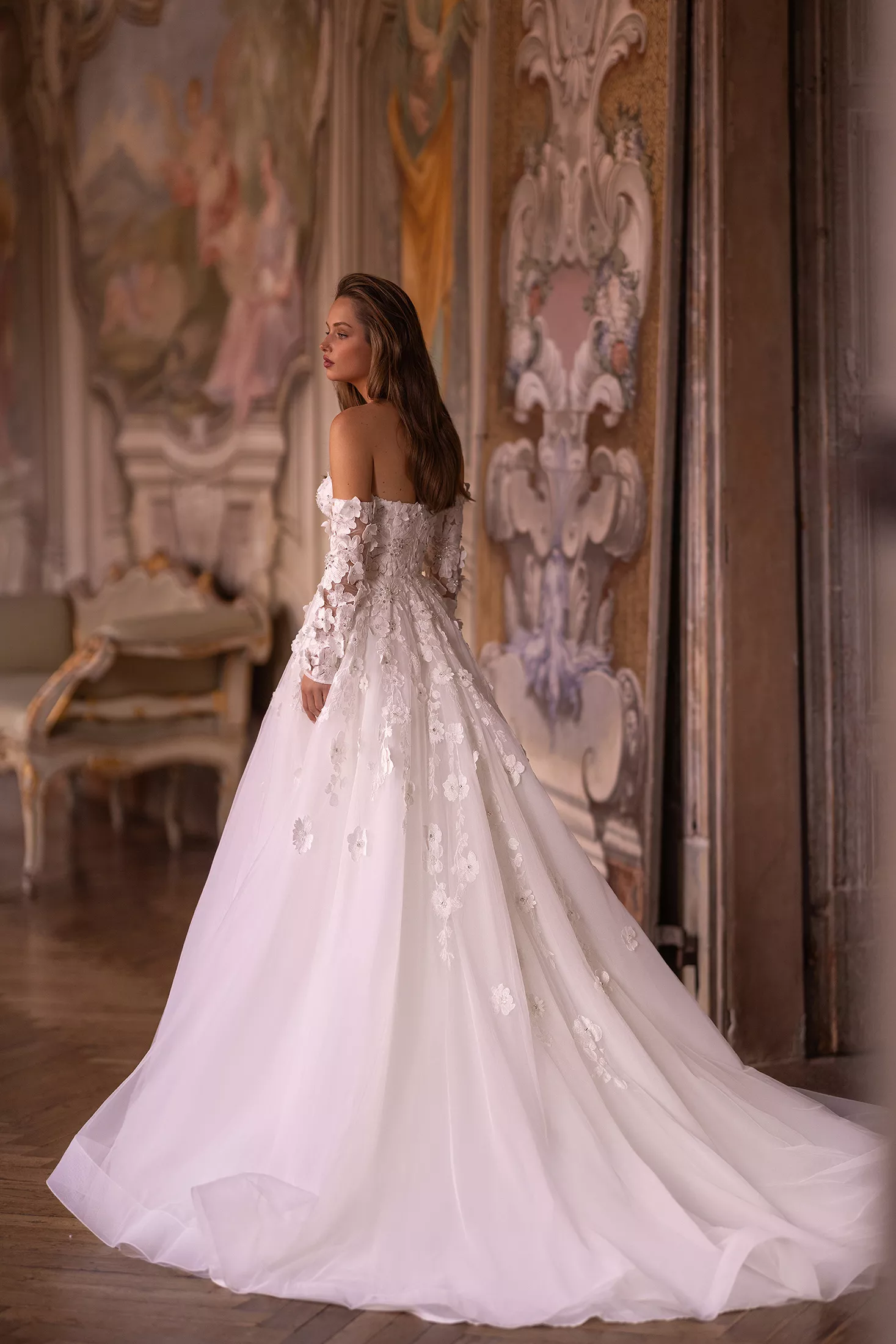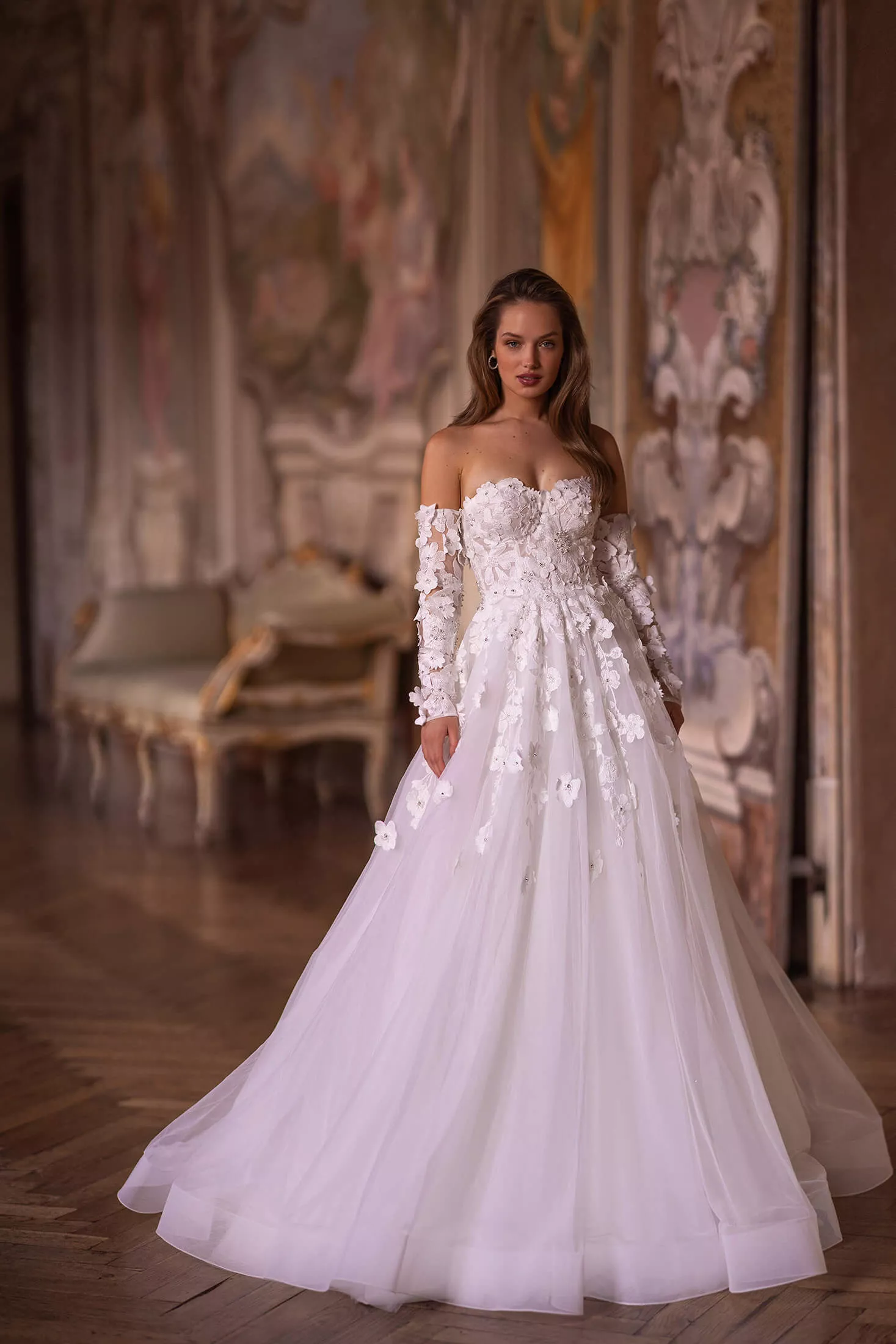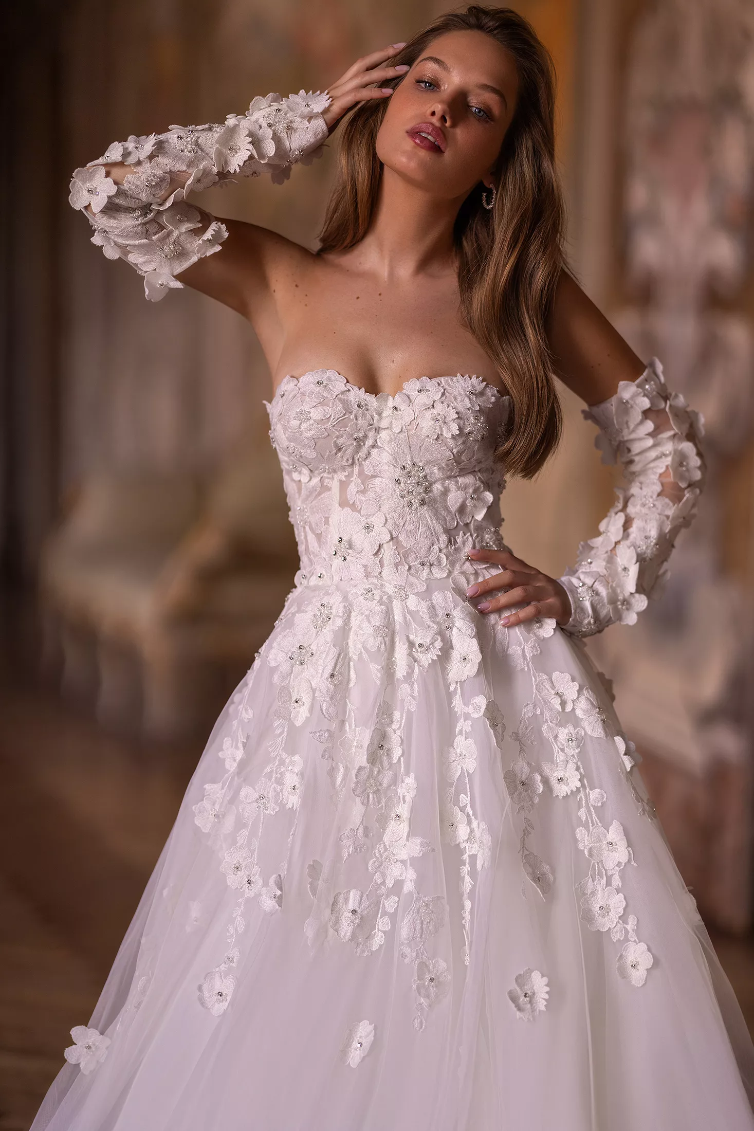 Cette robe de mariée sans bretelles incarne la féminité dans toute sa splendeur. Elle présente un corset cœur avec des bonnets définis, épousant parfaitement la silhouette de la mariée et la mettant en valeur. Une dentelle florale enchanteresse, délicatement ornée de perles et de sequins scintillants, orne le corsage et se prolonge gracieusement le long de la jupe, créant une aura féerique à chaque pas. Cette même dentelle envoûtante orne somptueusement les manches amovibles, offrant ainsi des options de style et de versatilité tout au long de la célébration. Pour ajouter une touche de drame, la robe est dotée d'une traîne chapelle qui laisse derrière elle un sillage de beauté à chaque mouvement de la mariée. La finition en crin de cheval à l’ourlet apporte une touche finale raffinée à cette création d’exception.