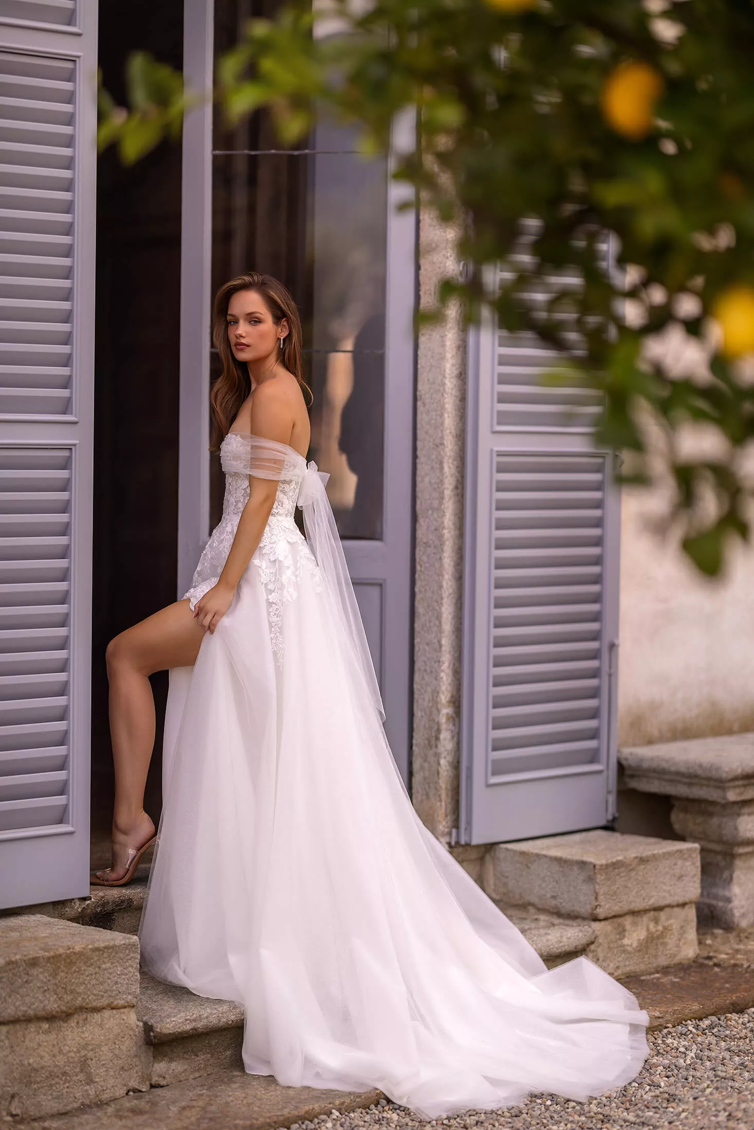 La robe Calista incarne l’élégance et le romantisme dans les moindres détails. Son corset bustier, magnifiquement confectionné en dentelle Chantilly ornée de sequins scintillants, épouse la silhouette avec une coupe flatteuse, tandis qu’un profond décolleté en V ajoute une touche de sensualité. Une délicate dentelle florale sublime le corsage et se prolonge gracieusement sur la taille avant de se fondre dans une jupe en tulle légère, rehaussée d’un fond pailleté et d’une fente haute pour une allure moderne et aérienne. Des manches tombantes en tulle, nouées dans le dos, apportent une touche féerique. Une traîne chapelle vient parfaire cet ensemble raffiné et enchanteur, idéal pour un mariage d’exception.