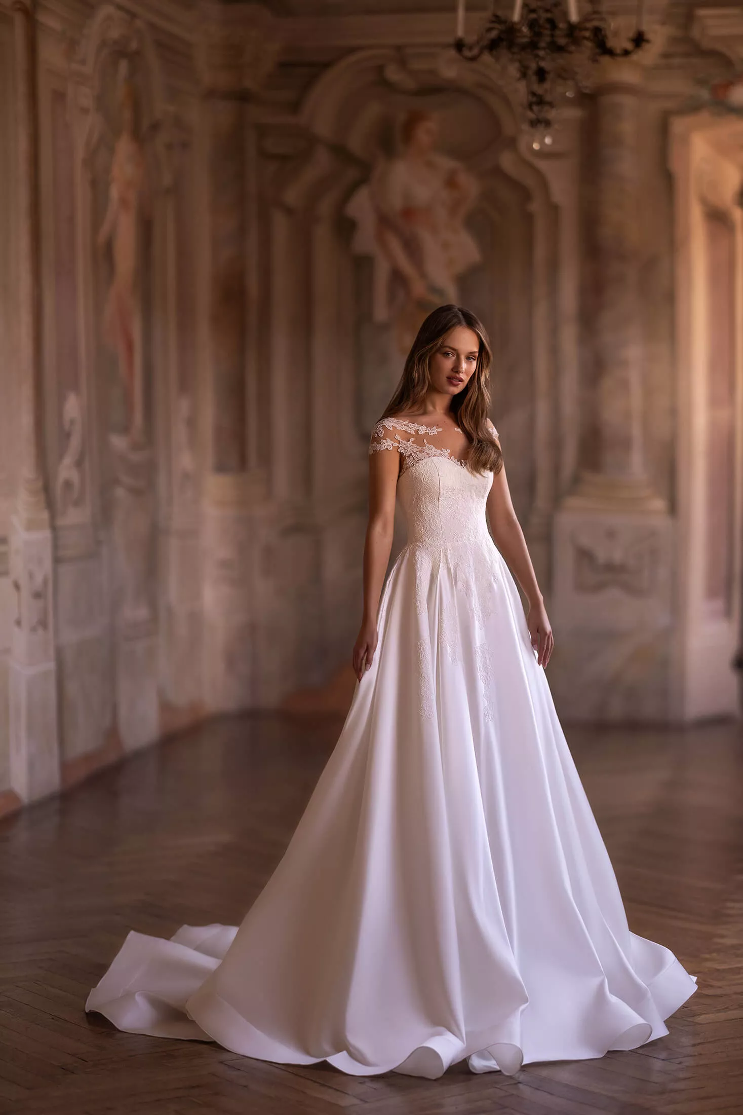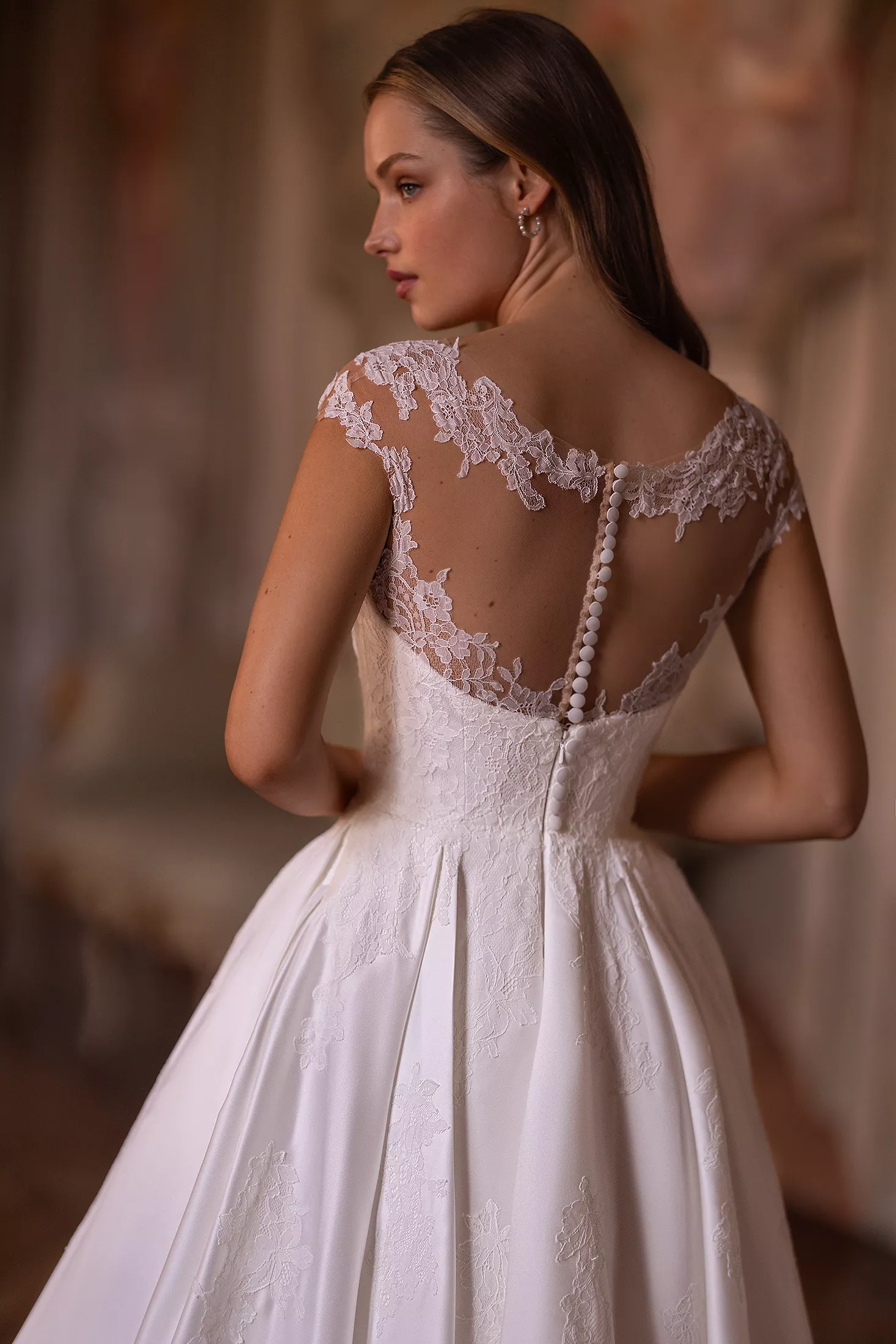 Osana est une robe de mariée en A-line, minimaliste et élégante, confectionnée en mikado intégral. Son corset bustier en cœur sans bretelles est sublimé par de délicates applications de dentelle Chantilly, qui ornent le corsage illusion, l'encolure et les épaules avant de s’étendre gracieusement sur la jupe au niveau de la taille. Pour parfaire cette silhouette raffinée, une traîne chapelle apporte une touche de majesté.