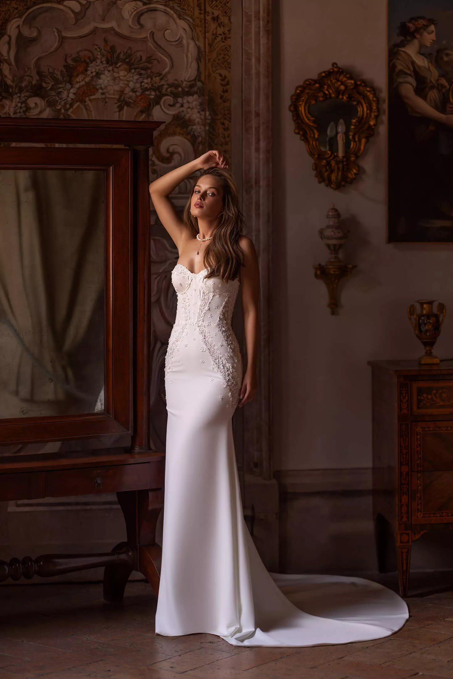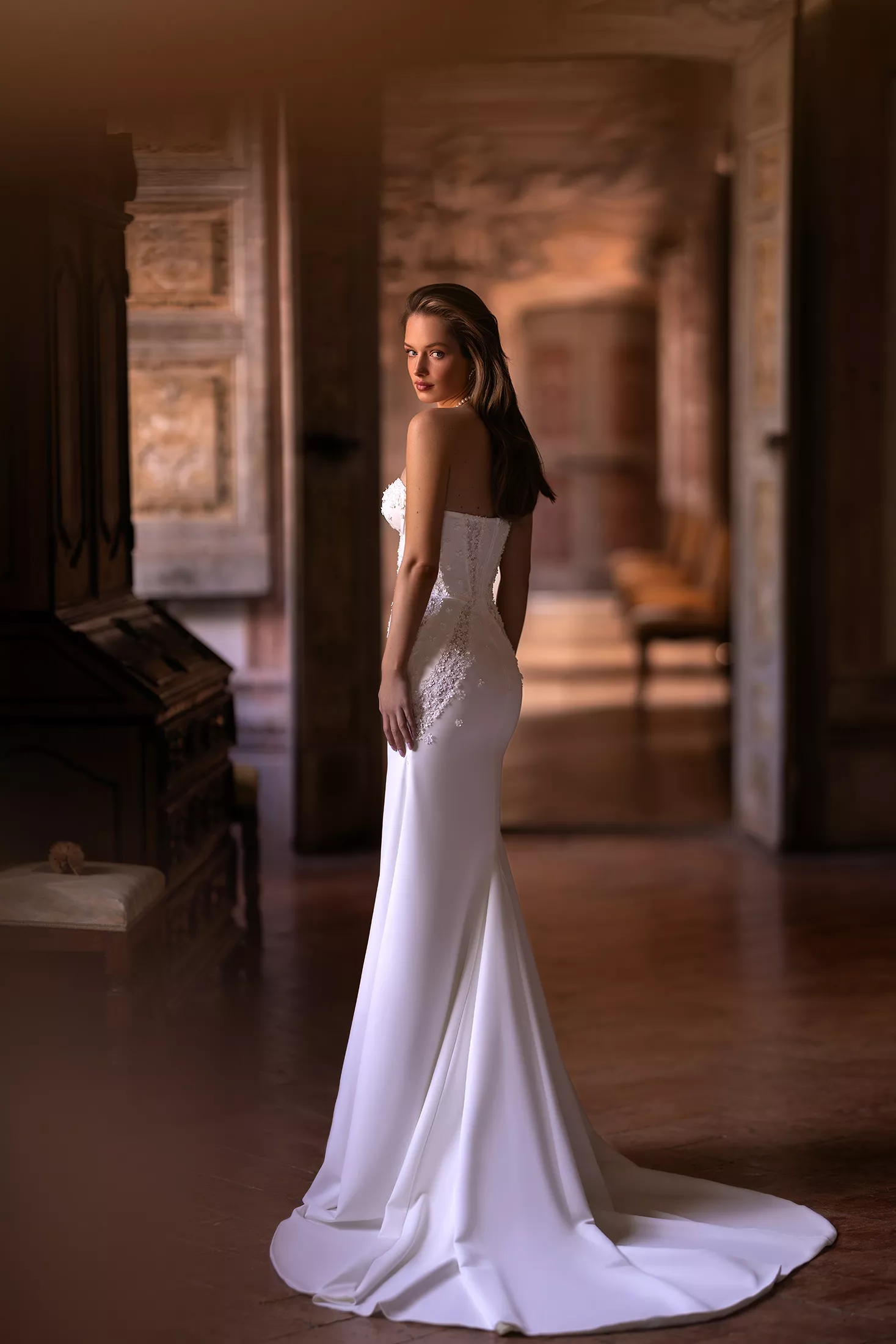 Cette robe de mariée ajustée incarne une élégance intemporelle. Son corset bustier sans bretelles, doté de bonnets structurés et d’un laçage apparent, est sublimé par des inserts en dentelle Chantilly illusion. Confectionnée en crêpe chiffon, elle dessine une silhouette féminine grâce à un corset sculptant en forme de sablier. Des appliques de dentelle florale en 3D, agrémentées de perles délicates, ornent le corset, la taille et les hanches pour une touche romantique. Une jupe amovible en mikado, rehaussée d’une ceinture, apporte du volume et de l'élégance, tandis qu’une traîne chapelle ajoute une note dramatique et sophistiquée.