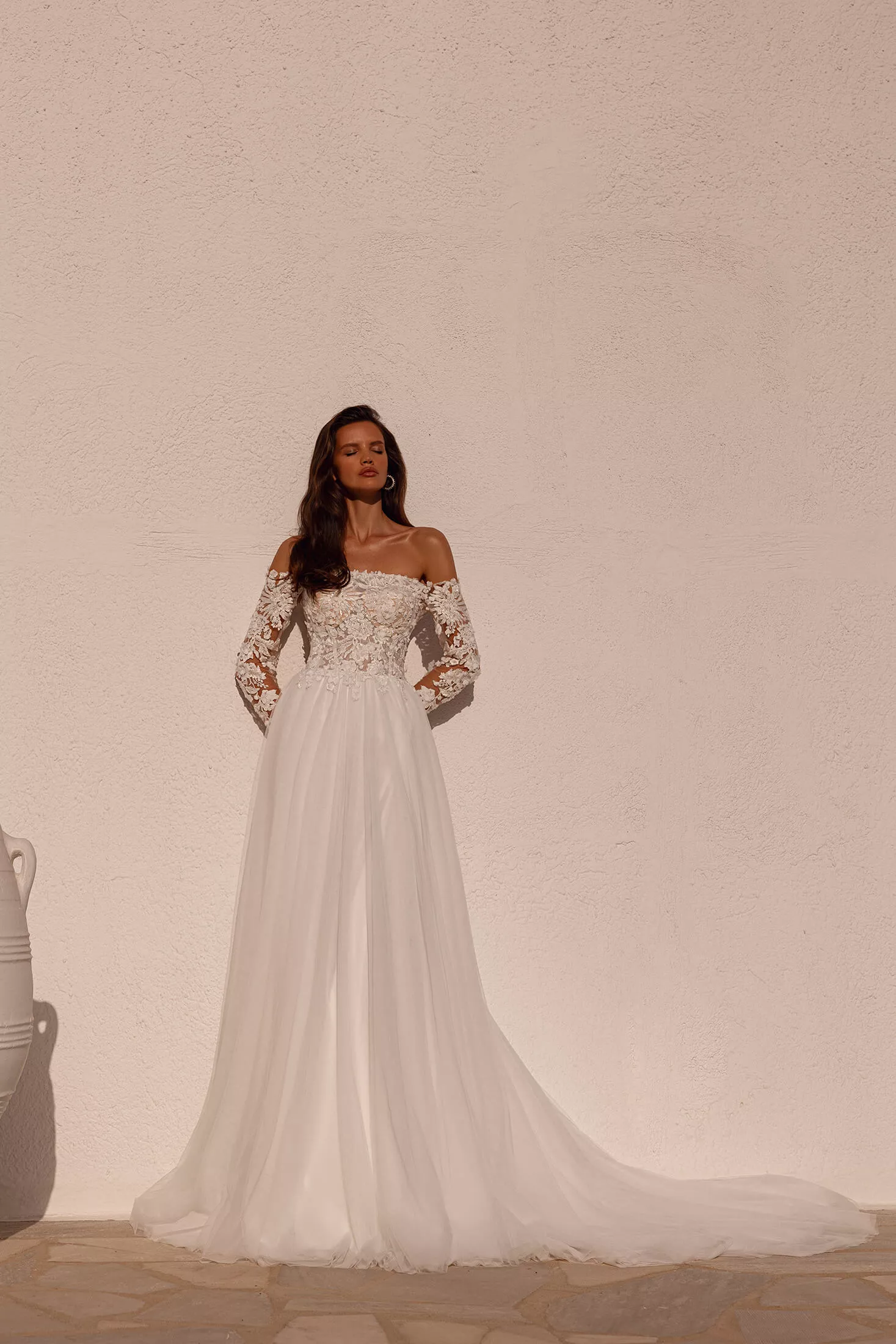 La robe de mariée Jimmy est une interprétation charmante du style bohème classique. Elle présente un corset à manches longues et décolleté bateau, confectionné dans une dentelle florale 3D, apportant une touche à la fois fantaisiste et texturée. Ce corset raffiné complète magnifiquement la jupe fluide en tulle, créant une harmonie parfaite entre élégance et charme bohème.