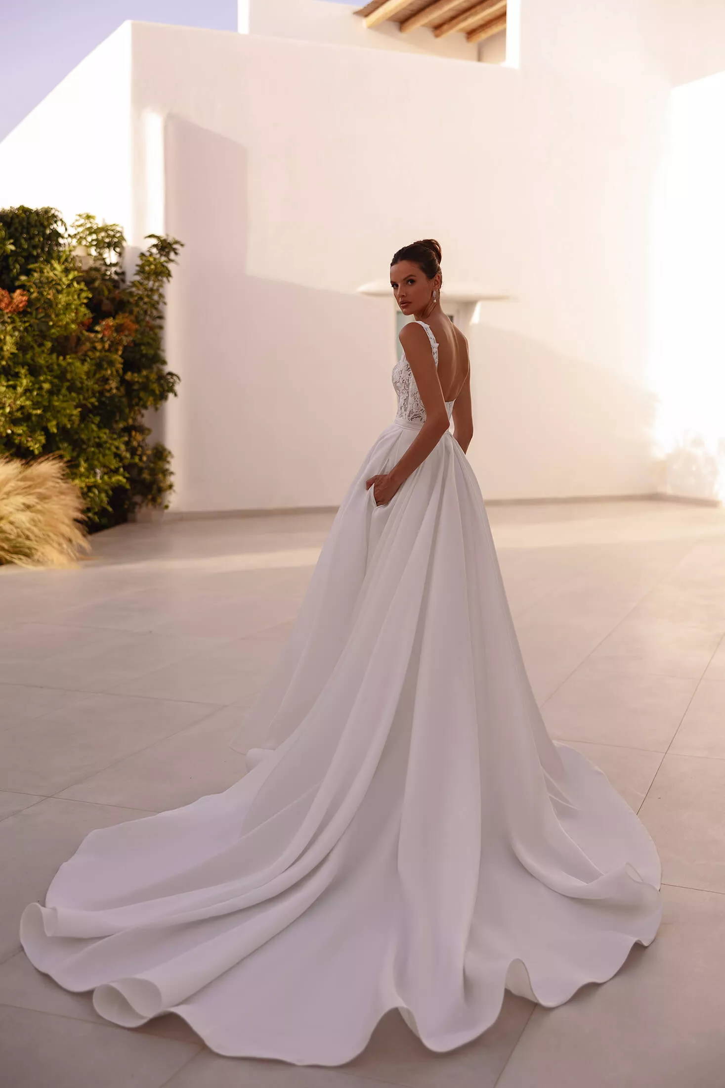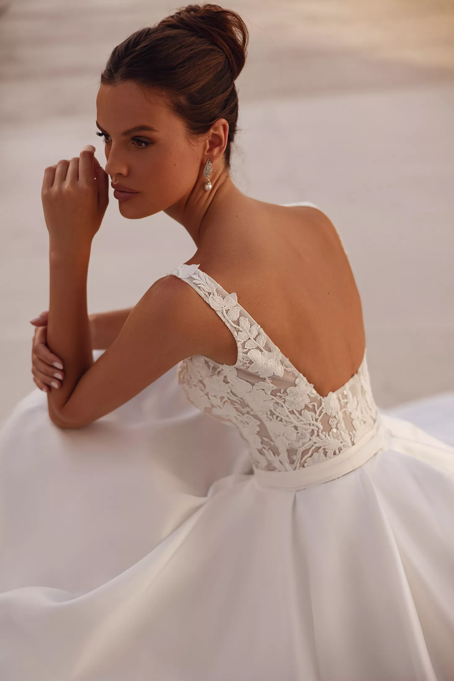 La robe de mariée Malma dégage une élégance intemporelle avec une touche moderne. Le corset semi-transparent présente un décolleté carré raffiné, confectionné dans une dentelle florale délicate, offrant une note sophistiquée et romantique. Le dos carré reflète parfaitement l'avant, créant un look harmonieux et équilibré. La robe se transforme en une jupe A-line en mikado, réputée pour son éclat et sa structure luxueuse. La jupe est agrémentée de poches pratiques et stylées, ajoutant un élément contemporain et fonctionnel à ce design classique. S’étendant en une traîne de longueur chapelle, la jupe est finie avec un tulle de crin pour maintenir la forme et la fluidité de la traîne.
