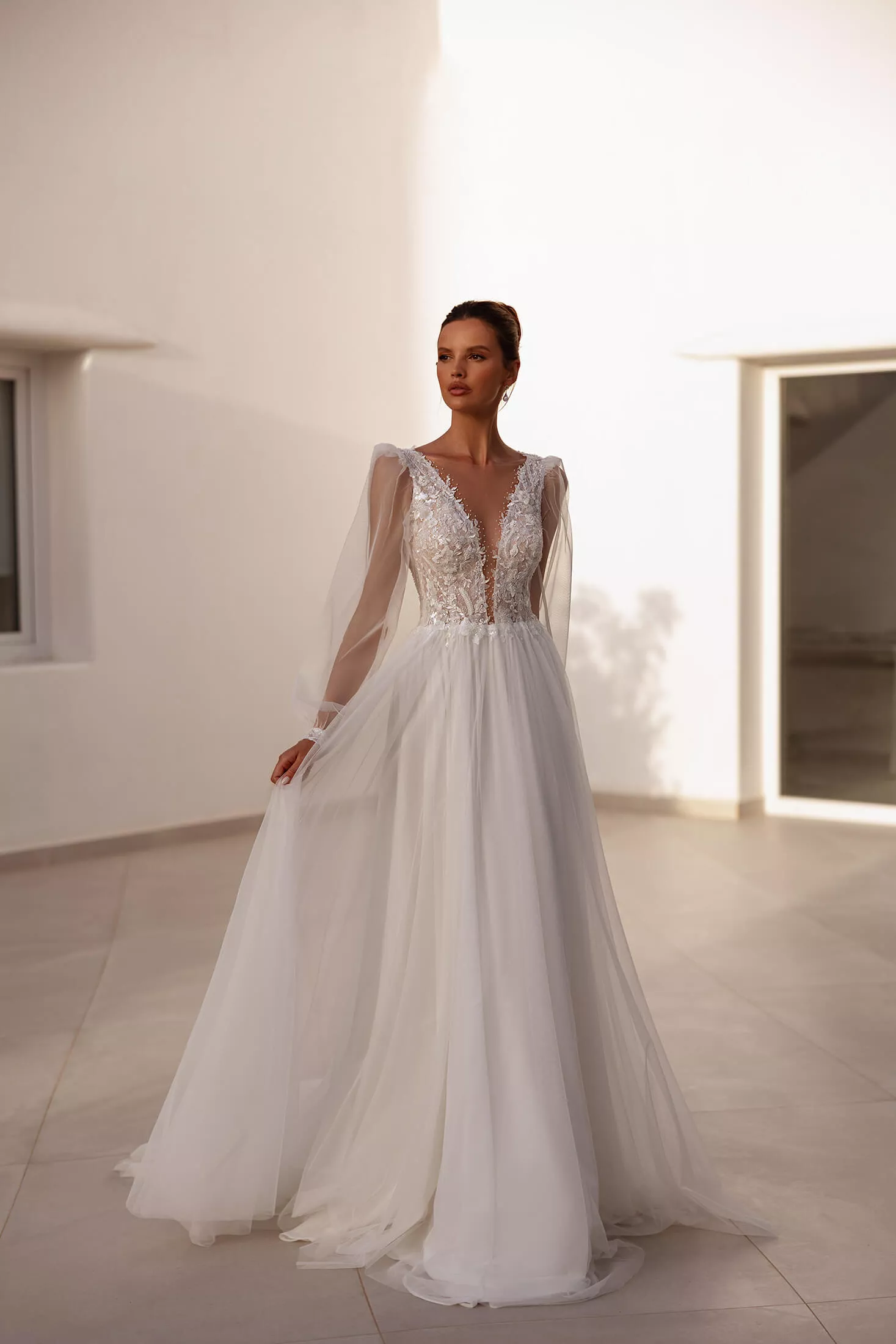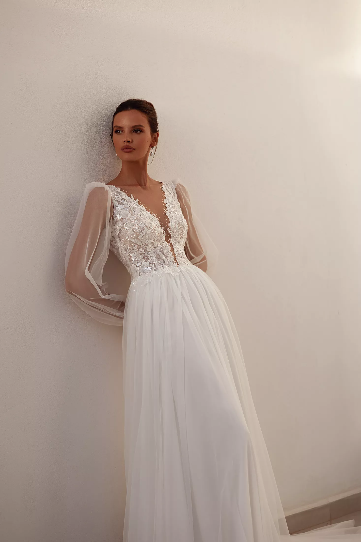 La robe Narina incarne la beauté éthérée et l'élégance du mariage. Le corsage est réalisé en délicate dentelle Chantilly, orné de dentelle florale, de sequins et de perles qui scintillent délicatement. Un décolleté en illusion en forme de V, orné de perles, ajoute à son charme. Les manches longues et transparentes, bouffantes, tombent gracieusement des épaules, créant une silhouette féerique et renforçant le charme envoûtant de la robe. La jupe en tulle léger s'évase doucement à partir de la taille, complétant ainsi l'apparence rêveuse et romantique de l'ensemble.