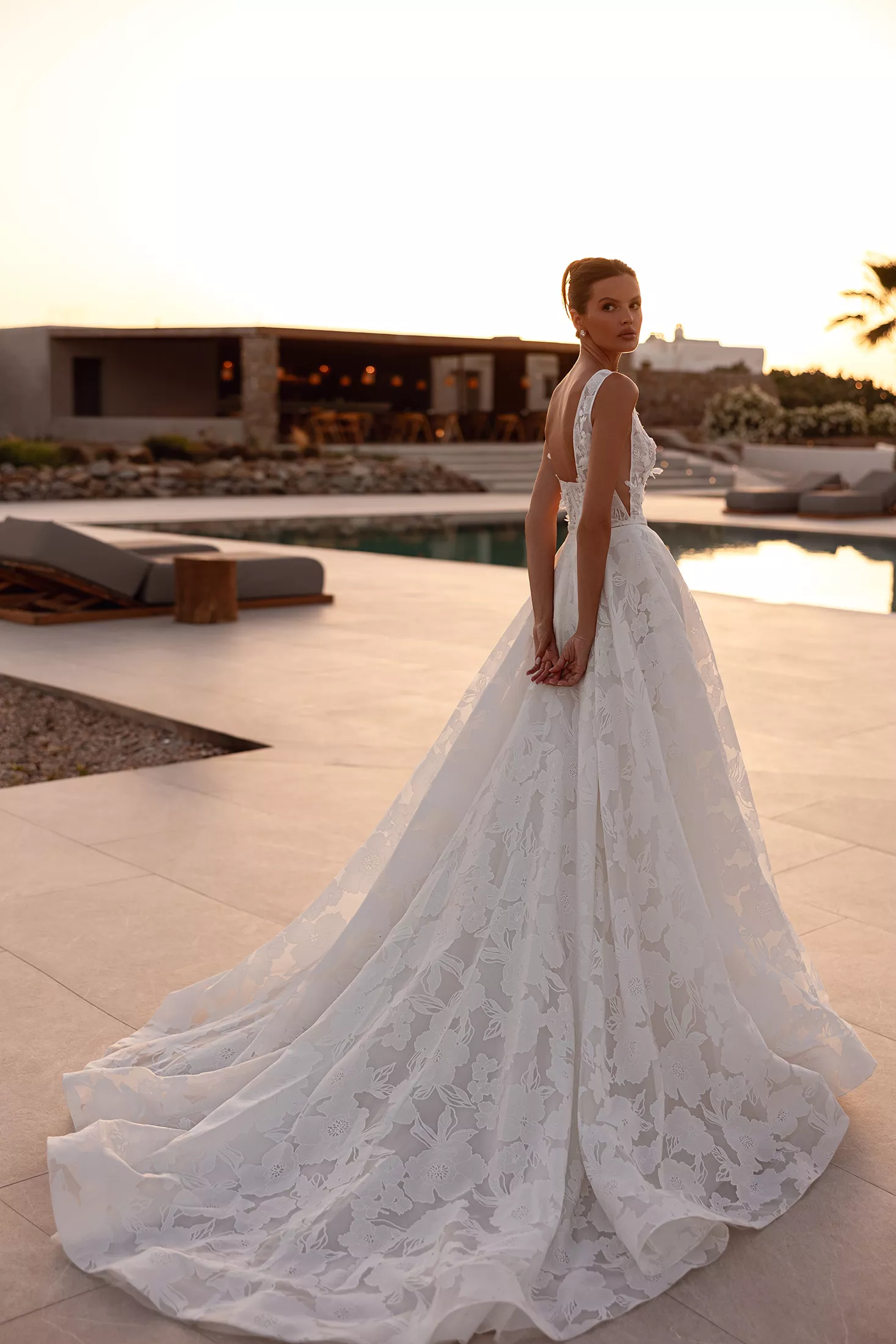 La robe de mariée Soraya incarne l'élégance intemporelle, réalisée en organza à motif floral tout-over qui dégage une beauté délicate. Le corsage présente un col rond classique, complété par des panneaux latéraux en illusion qui créent un effet amincissant et flatteur sur la silhouette. Pour ajouter une touche de polyvalence et de charme, Soraya inclut un nœud de ceinture amovible à la taille, permettant aux mariées de personnaliser leur look avec une sophistication subtile. La robe se termine par un ourlet orné d'un fil de crin, qui renforce la structure de la jupe et ajoute une fluidité gracieuse à chaque mouvement de la mariée.