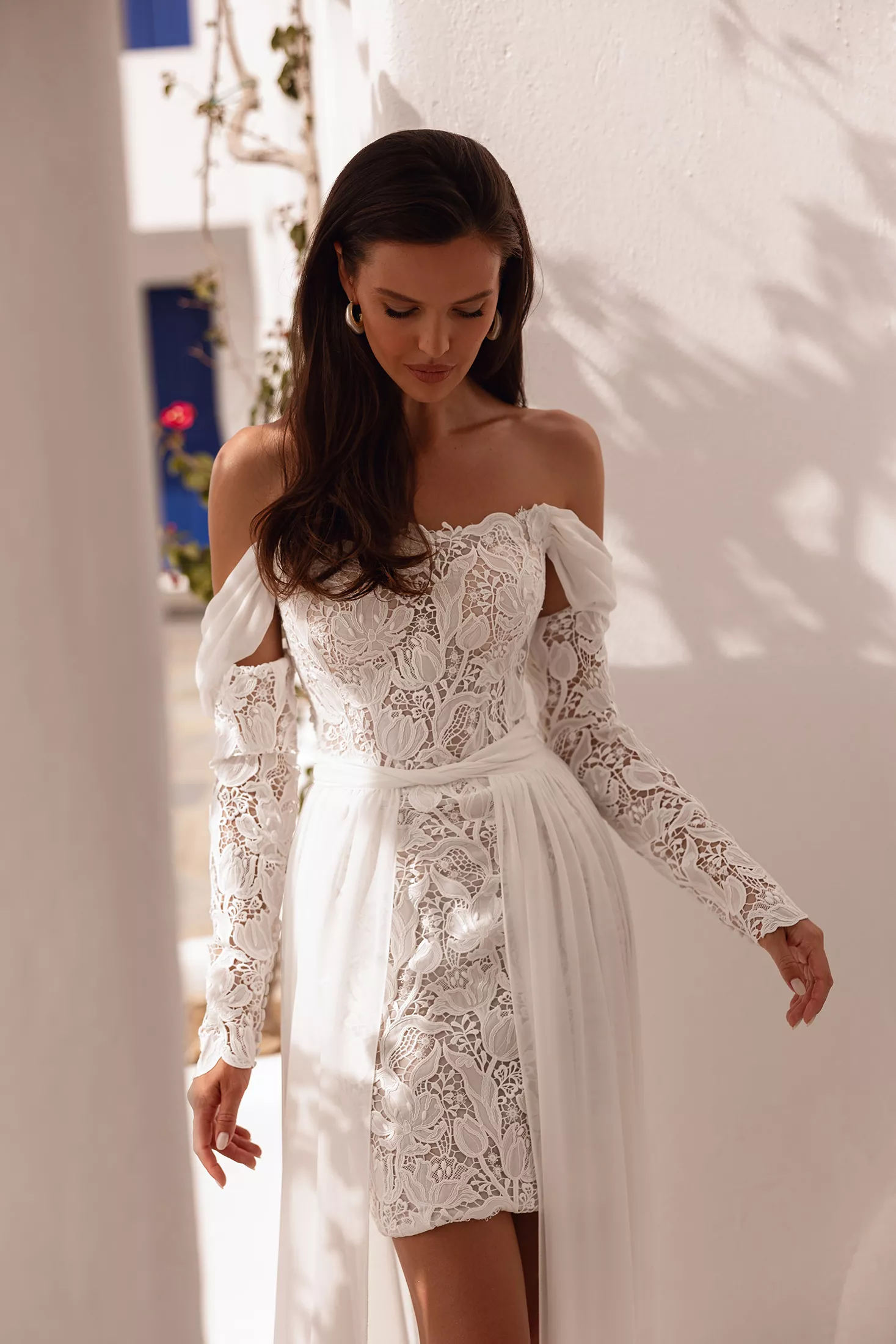 La robe Yuji est une création captivante et jeune, taillée dans une dentelle macramé fine et délicate. Ce modèle mini présente des bretelles en chiffon qui tombent gracieusement, apportant une touche de légèreté éthérée. Elle est dotée de manches en dentelle amovibles, offrant des options de personnalisation pour la mariée moderne. Pour parfaire le tout, une traîne en chiffon légère et fluide, également amovible, ajoute un effet dramatique. Cette robe est idéale pour la mariée qui souhaite allier gaieté et élégance en ce jour spécial.