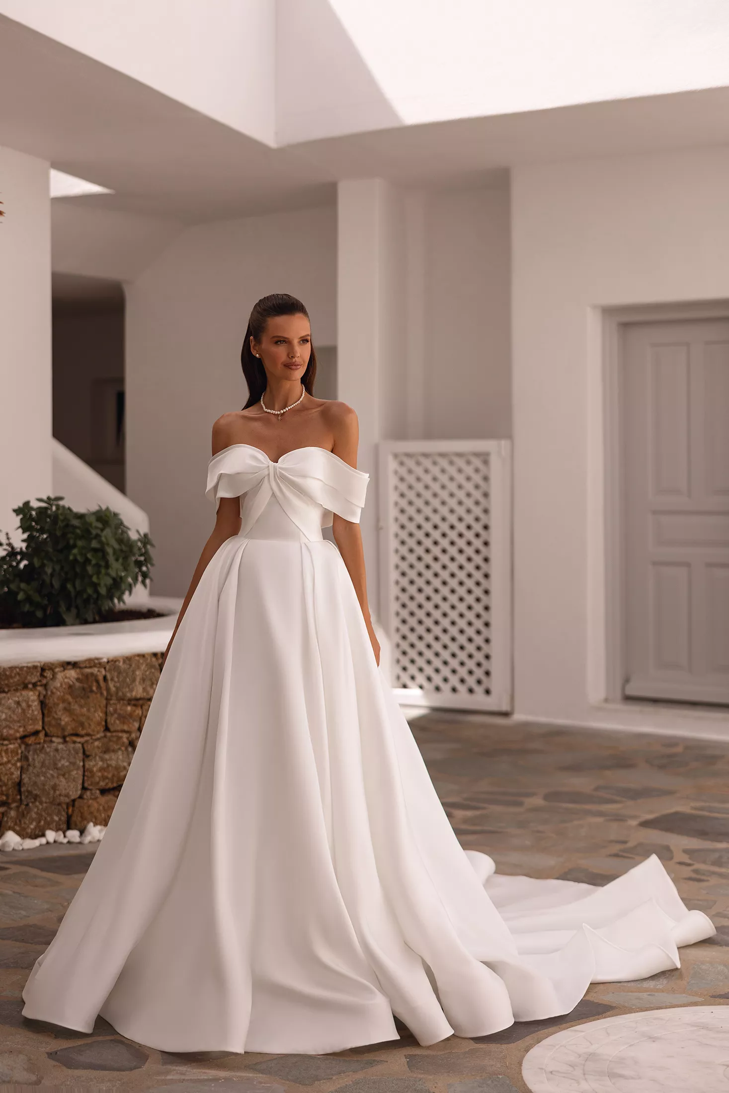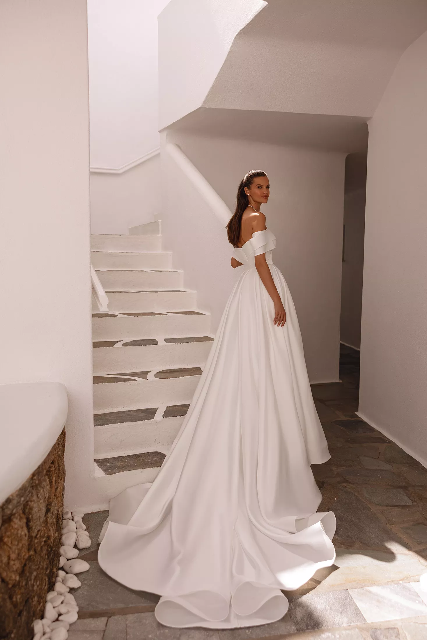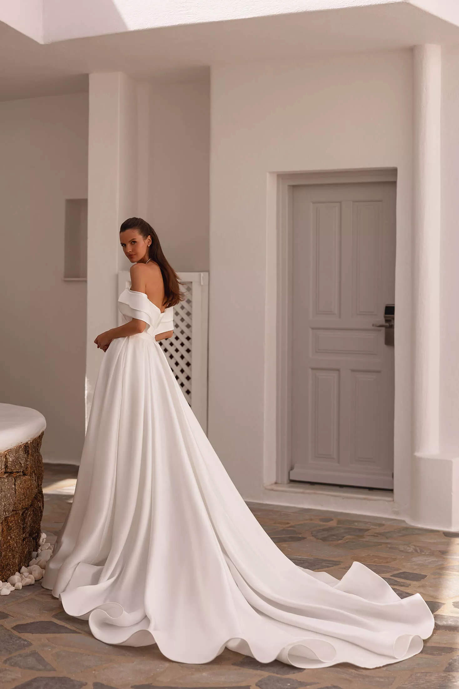 La robe de mariée Liv incarne la simplicité raffinée, conçue en luxueux mikado de bout en bout. Le corsage présente un détail off-the-shoulder délicat qui fusionne élégamment le décolleté en cœur avec un nœud sophistiqué. La robe descend en une silhouette épurée, se prolongeant en une traîne de chapelle pour un effet gracieux et allongé. L'ourlet est fini avec un bord en crinoline, assurant une finition structurée et soignée. La robe Liv est parfaite pour la mariée moderne qui apprécie l'élégance discrète et le style intemporel.